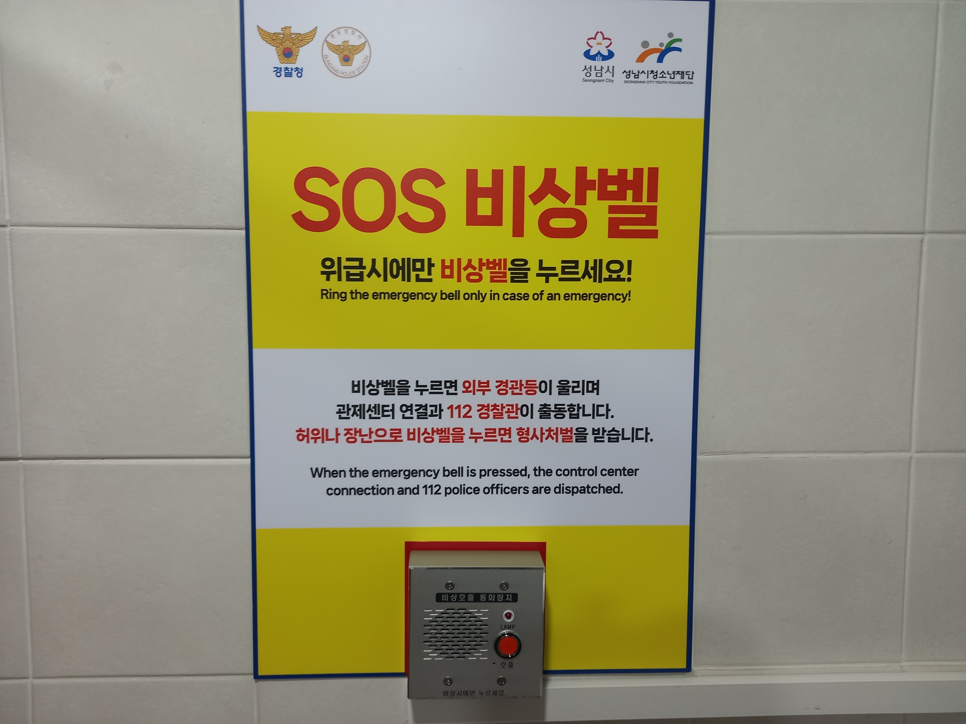 ○ 귀하께서 건의하신 SOS비상벨 안내판 문구에 대해 정정하여 변경처리 즉시 조치하도록 하겠습니다.