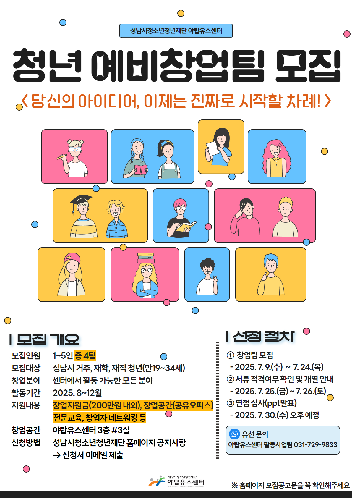 2025년 하반기 성남시청소년청년재단 야탑유스센터와 함께할 청년 예비창업팀을 다음과 같이 모집하오니 청년들의 많은 관심과 참여 바랍니다.