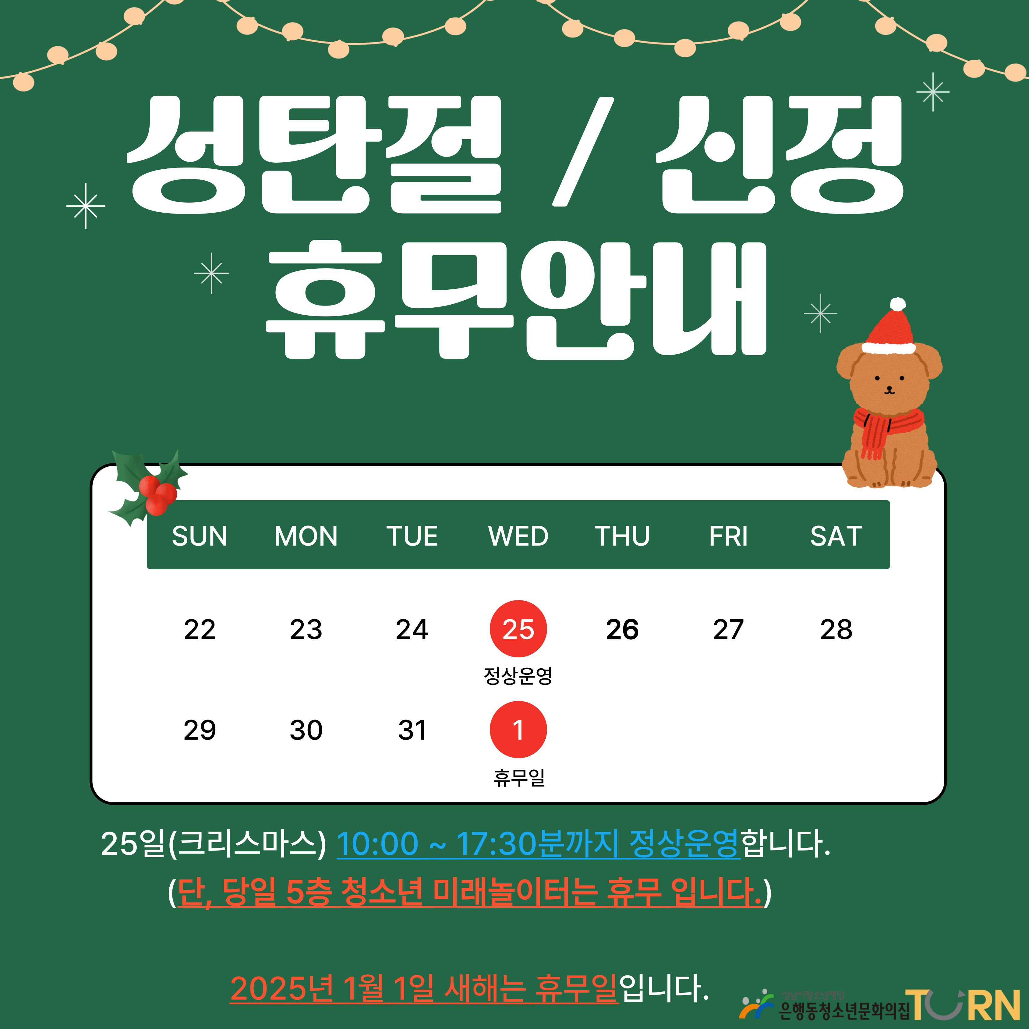 은행동청소년문화의집은 25일 크리스마스 정상운영, 2025년 1월 1일은 문화의집 전체 휴관으로 휴무입니다.