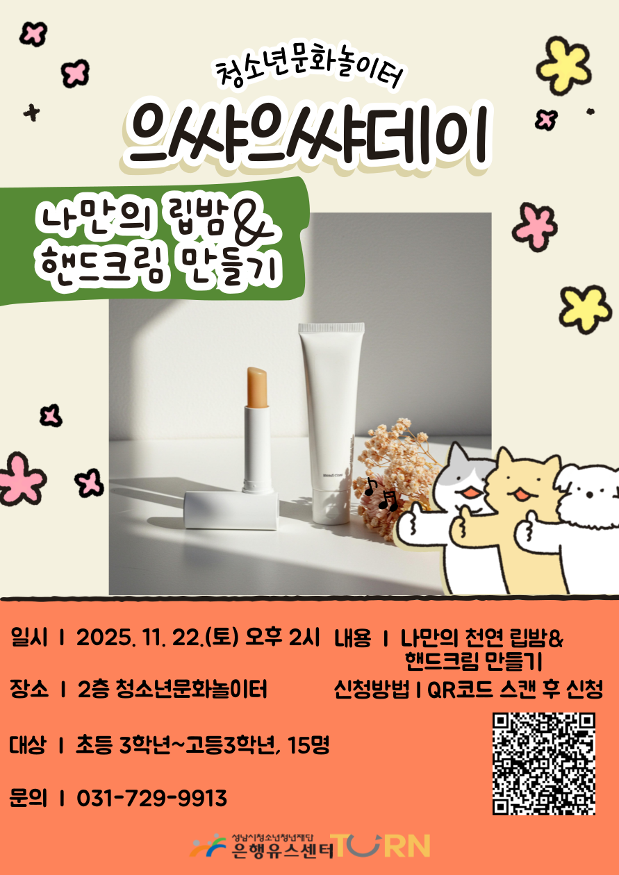 청소년 문화놀이터(2층) 으싸으싸데이 [나만의 립밤&핸드크림 만들기] 모집!