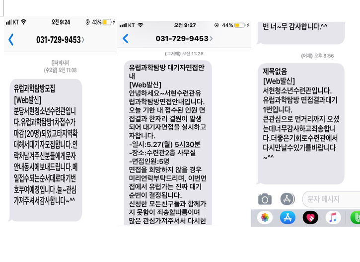 성남시 거주자 대상으로 1차 접수가 마감되었고, 타지역 대기자들을 메일접수 순서대로 대기번호를 부여한다고 해서 1번으로 접수했습니다. 그랬는데 일요일에 "한 명이 결원이라 대기자 5명을 월요일에 면접한다"는 문자를 받았습니다. 문자로 알려준 것처럼 메일 접수 순이 아니고, 접수한 대기자 5명이 1자리를 두고 면접을 봐야한다는 겁니다. 아이 견문 넓히라고 적지 않은 돈 들여서 보내는 데 경쟁까지 시켜야 되나 라는 생각이 들었지만, 그래도 회사일도 남겨두고, 아이는 학원도 빠지고 면접에 참석합니다. 결과는 첨부파일과 같이 "면접결과 대기 1번입니다."
