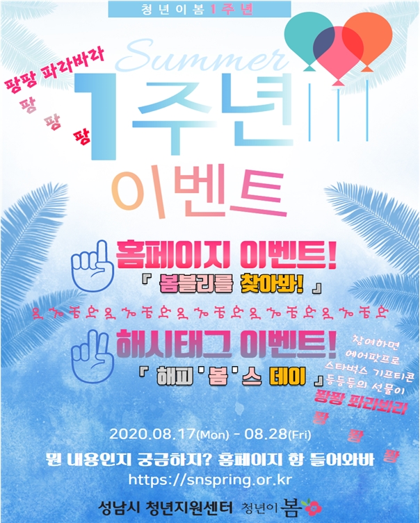 성남시청소년재단(대표이사 진미석)이 위탁 운영하는 성남시청년지원센터 ‘청년이봄’이 오는 8. 28.(금) 개소 1주년을 맞이하여 청년을 대상으로 다양한 이벤트를 개최한다.