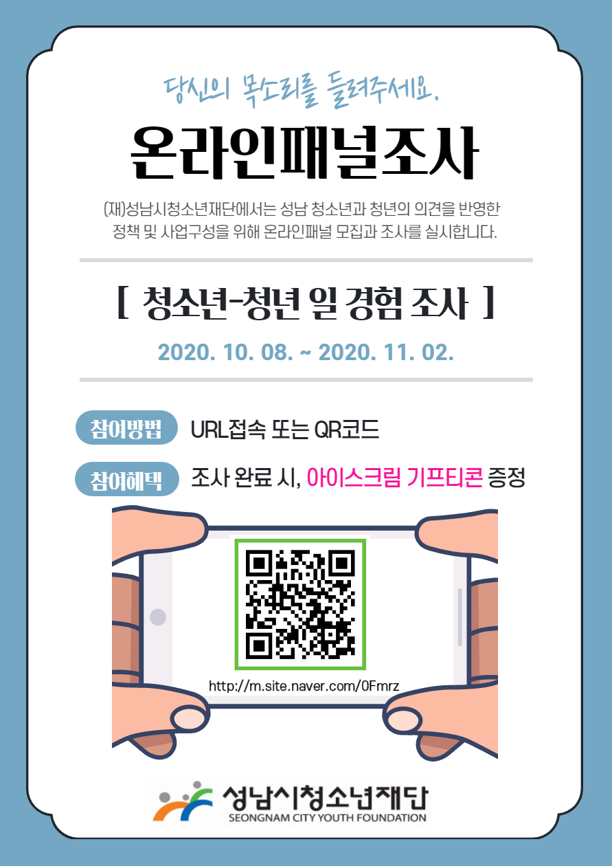 성남시청소년재단(대표이사 진미석)은 지역 청소년과 청년의 의견 수렴과 만족도 제고를위한 ‘성남 청청(청소년청년) 온라인 패널’을 모집 중이다.