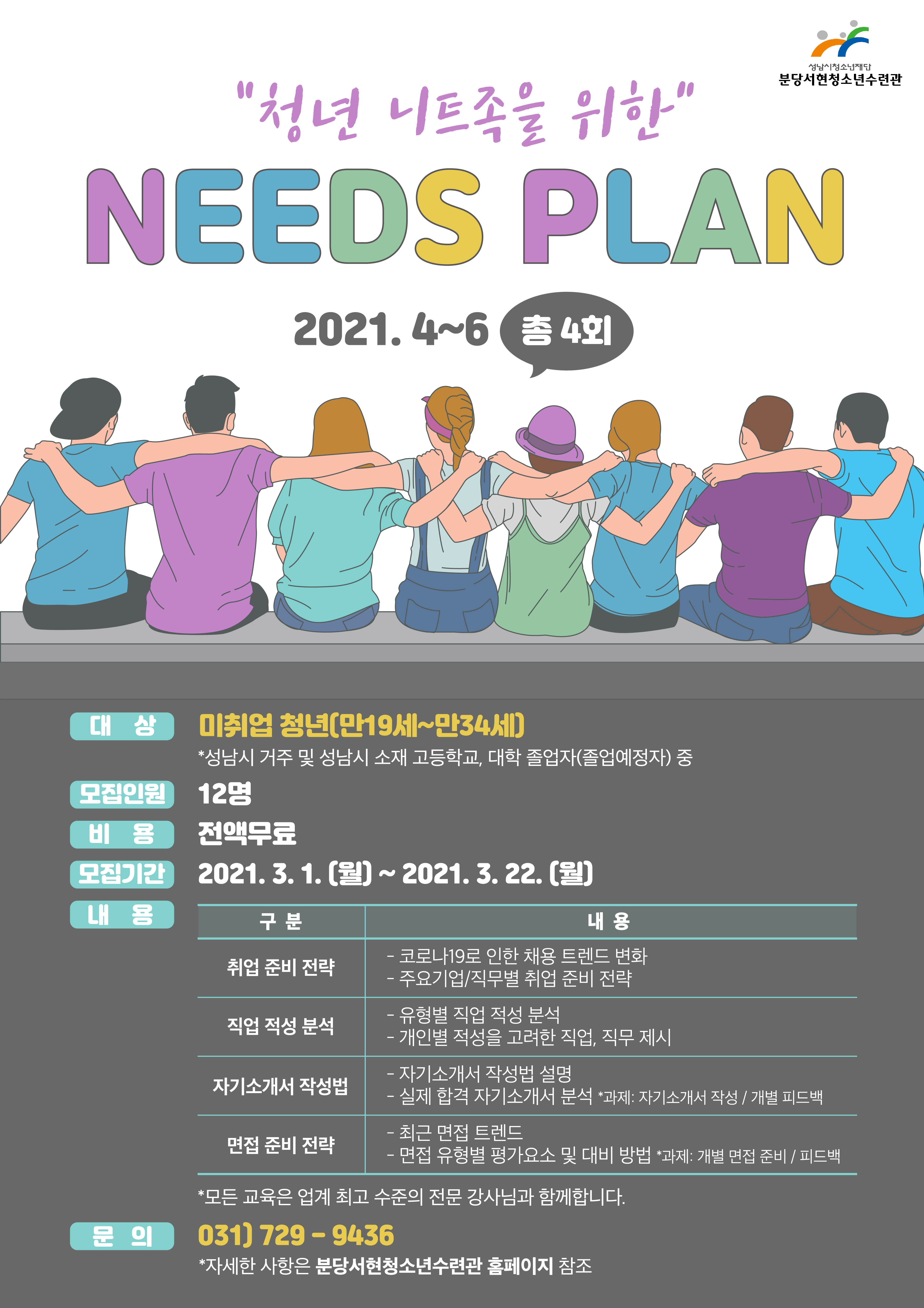 성남시청소년재단(대표이사 진미석) 분당서현청소년수련관은 청년 지원 프로젝트의 일환으로 취업 준비생들을 위한 [청년 니트(NEET: 고용, 교육 혹은 훈련을 받지 않은 청년)족을 위한 Needs Plan]의 참가자를 3월 22일까지 모집한다.