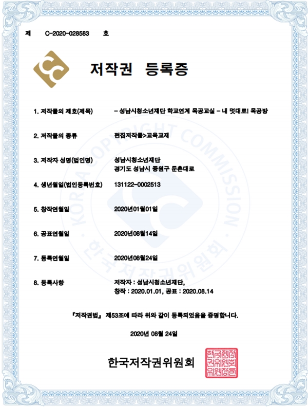 성남시청소년재단(대표이사 진미석)은 지난 24일 학교연계 목공교실 『내멋대로! 목공방』 프로그램의 저작권등록(제C-2020-028583호)을 마쳤다.