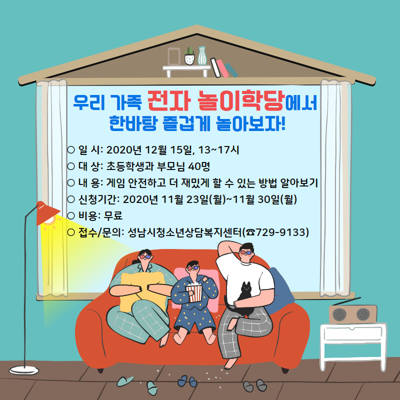 성남시청소년재단(대표이사 진미석)은 게임 과이용으로 인하여 가족 내 갈등과 충돌을 겪는 청소년 자녀와 보호자를 대상으로 오는 12월 5일, ‘가족 워크숍 <전자 놀이학당>’을 개최한다고 밝혔다.