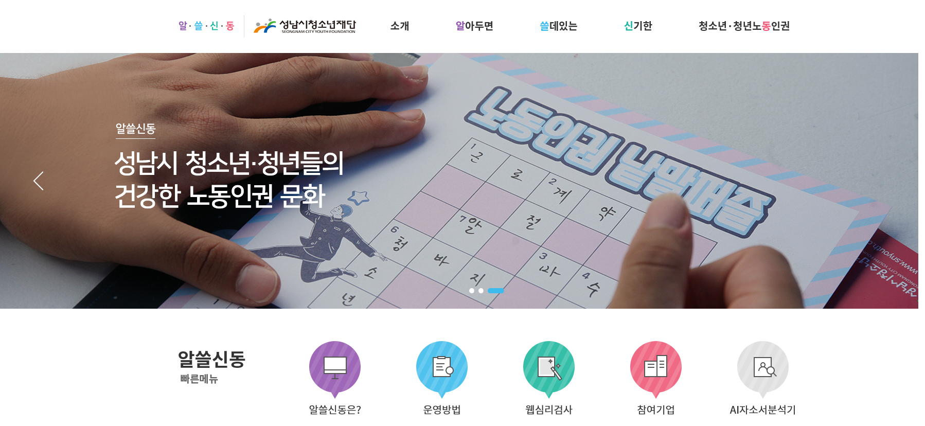 성남시청소년재단은 지난 10월 전국 최초 온라인 노동인권박람회를 개최하였다. 온라인 행사를 위해 웹 홈페이지를 별도로 개설하여‘알아두면’, ‘쓸데있는’, ‘신기한’, ‘청소년·청년 노동인권’ 4개의 영역으로 구분하여 운영하였으며, 청소년과 청년이 실질적으로 도움이 되는 노동인권 정보를 실어 박람회를 성공적으로 마쳤다.