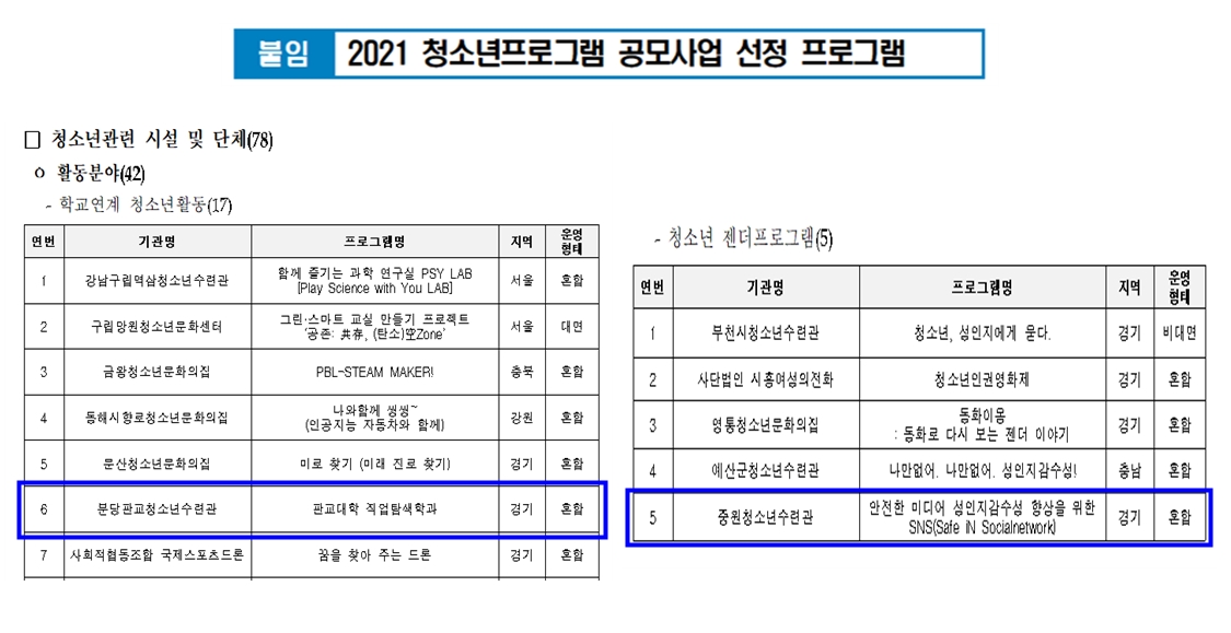 이번 공모에 선정된 프로그램은 △중원청소년수련관의(청소년 젠더프로그램분야) 청소년의 안전한 미디어 성인지 감수성 향상을 위한 『S.N.S(Safe In Socialnetwork)』와 △분당판교청소년수련관의(학교연계 청소년활동분야) 판교25통 삶의 터전에서 배우는 진로체험교육『판교대학 직업탐색학과』총 2개의 사업이다.