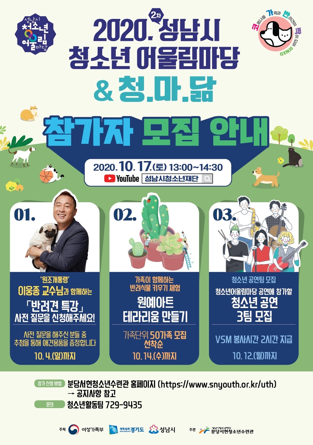 성남시청소년재단 유튜브 채널로 생중계될 본 행사는 ‘코.가.반.짝(코로나를 가족과 반려견이 짝이되어 이겨내자)’라는 부제에서 느껴지듯이 코로나-19를 겪으며 더욱 커진 가족의 소중함과 가족만큼 사랑하는 반려동물 혹은 반려식물을 주제로 한다.