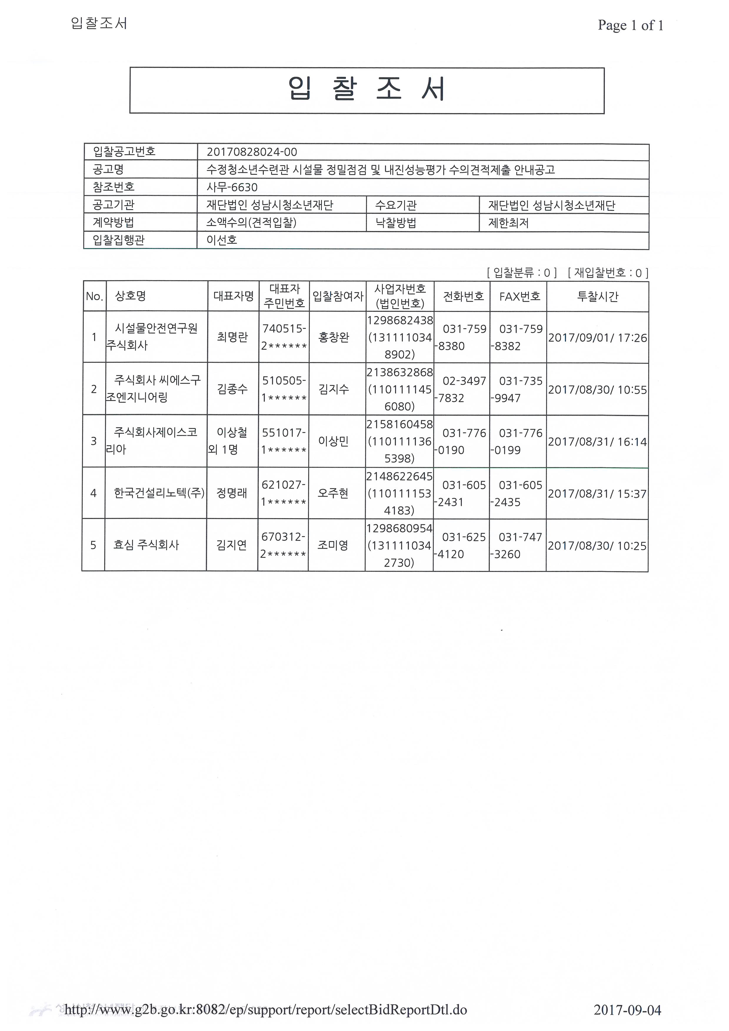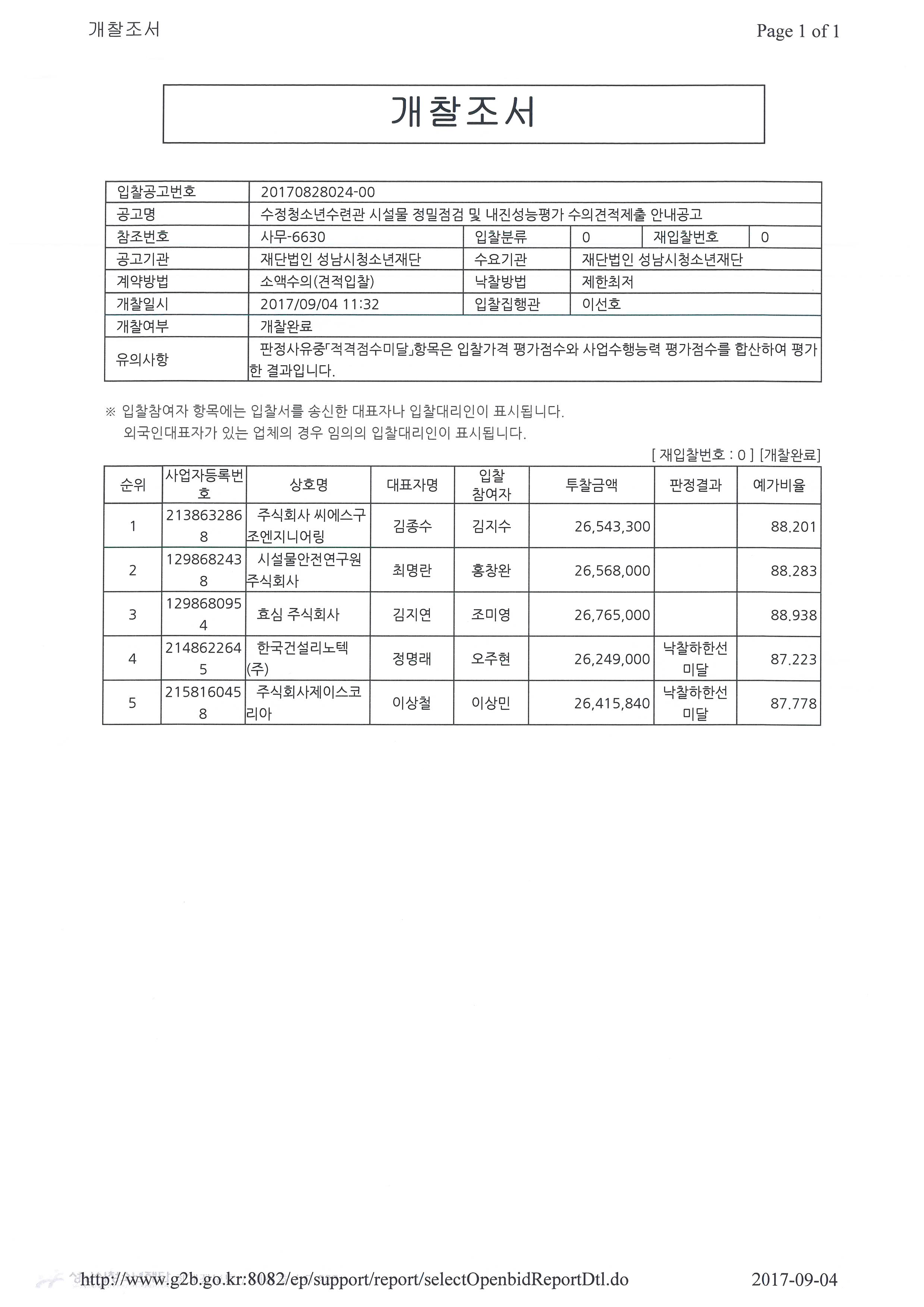 2. 위 호와 관련, 수정청소년수련관 시설물 정밀점검 및 내진성능평가 소액수의 견적제출 안내공고 결과를 아래와 같이 보고 합니다.