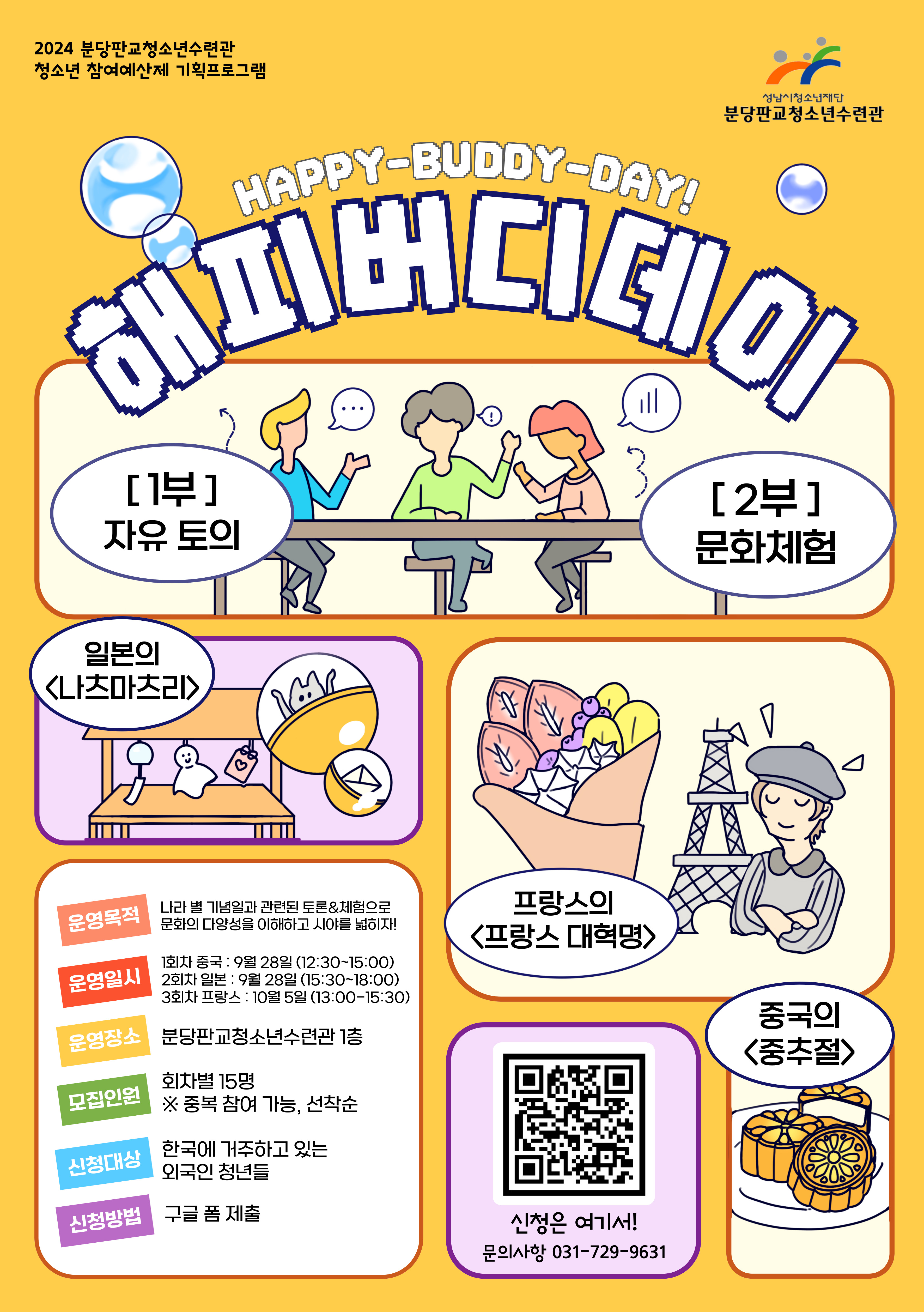 분당판교청소년수련관에서는 청소년의 주도적인 참여와 제안을 바탕으로 하는 청소년참여예산제 아이디어대회에서 선정된 글로벌 문화교류 및 체험활동 ‘Happy Buddy Day!’ 프로그램을 운영합니다. 각국의 기념일과 문화를 이해하고 국내·외 청년 간 교류활동에 관심있는 외국 국적 청년들의 많은 관심과 추천, 참여 바랍니다.
