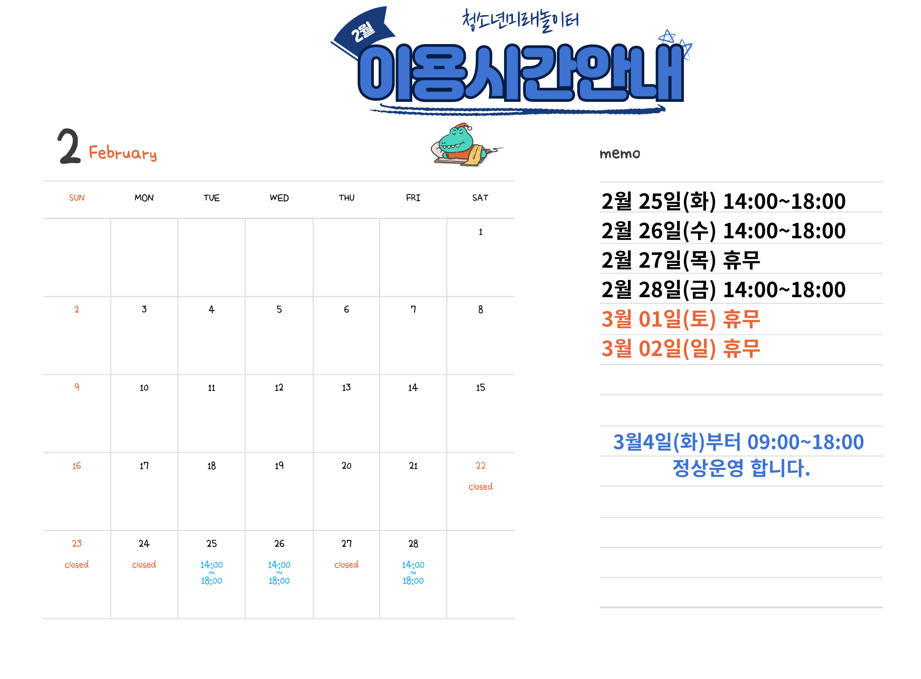 <2월> 은행유스센터 청소년 미래놀이터(5층) 이용시간 안내 입니다:)