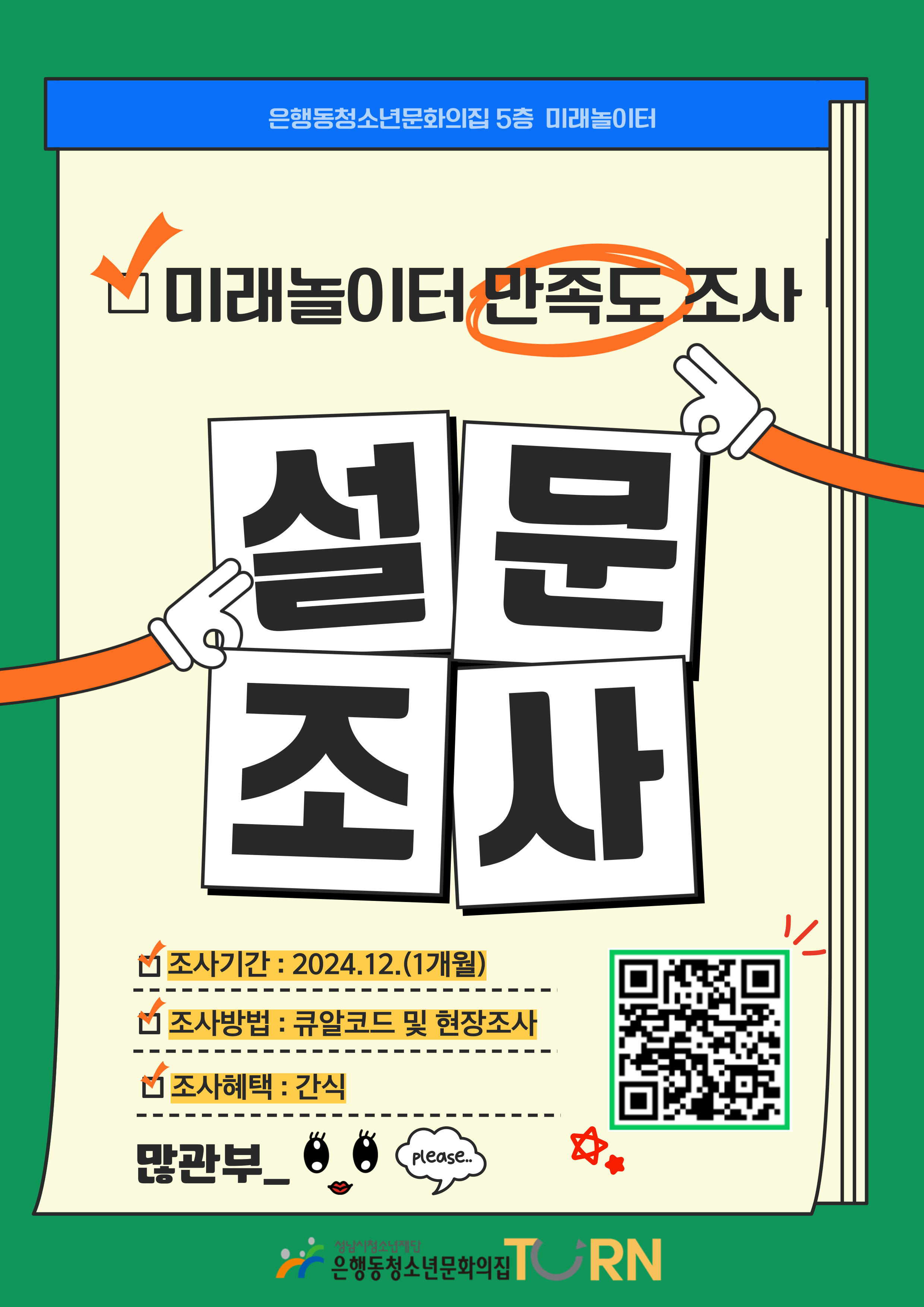 - 내용: 2024년도 청소년 미래놀이터에 대한 만족도 조사 작성하고, 간식 받아가세요!