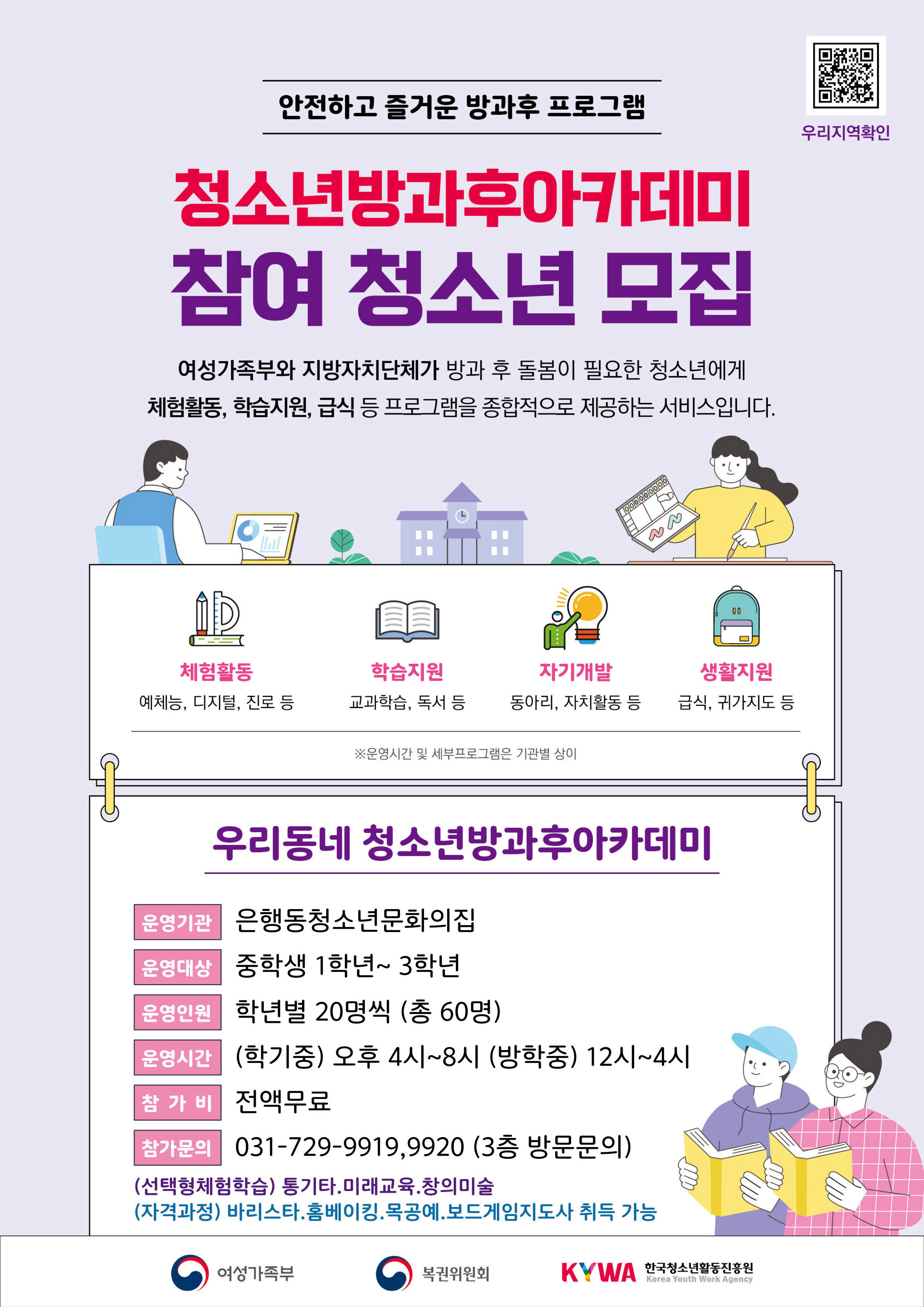 - 여성가족부와 지방자치단체가 방과 후 돌봄이 필요한 청소년에게 체험활동, 학습지원, 급식 등 프로그램을 종합적으로 제공하는 서비스!