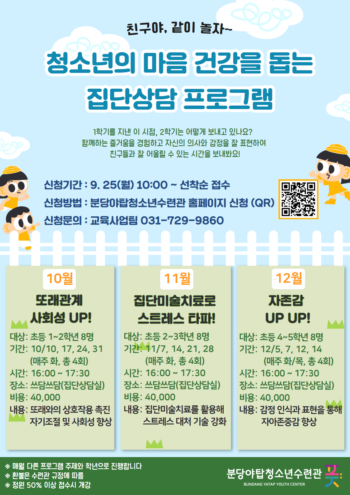 장소 | 야탑청소년수련관 2층 쓰담쓰담(집단상담실) | ||
