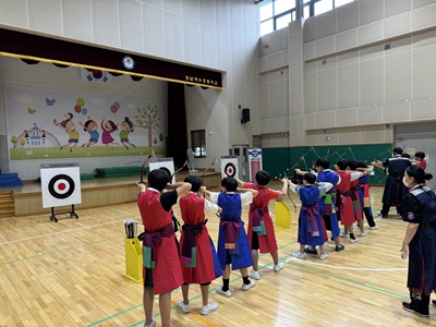 분당판교청소년수련관에서는 성남여수초등학교 6학년 5개 학급 129명 대상 청소년 전통무예 체험활동 지원사업 국궁교실을 운영합니다.