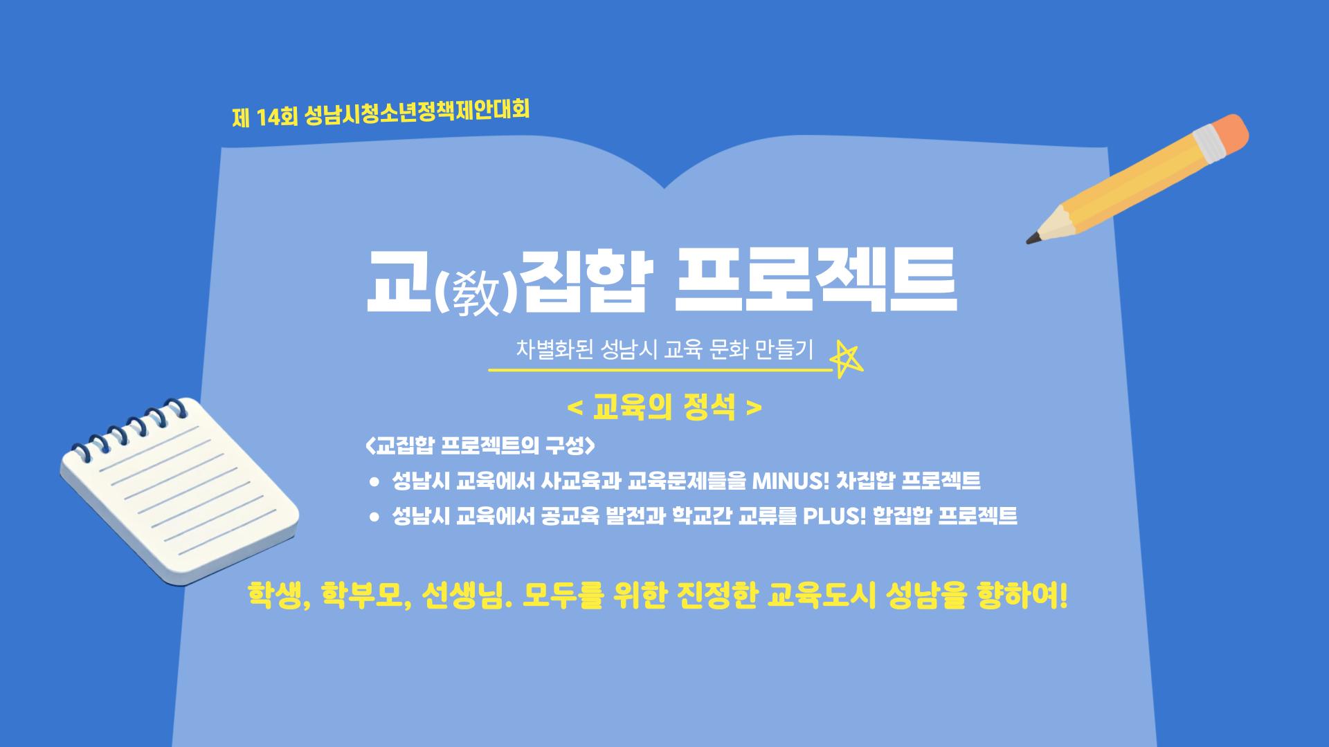 ▶ 결론적으로 성남시의 차별화된 교육문화를 만들기 위해서는 공교육의 다양화 및 활성화와 사교육 경감이 필요하다. 따라서 우리 <교육의 정석> 팀은 성남시의 교육공동체가 모두 함께하는 건강한 교육 생태계 구축을 위해 교(敎)집합 프로젝트를 계획하였다. 교(敎)집합 프로젝트란, 성남시의 교육에 다양성을 추가하고 학교 간 교류를 활성화하자는 뜻을 담은 합집합 프로젝트와 성남시의 교육에서 사교육을 빼자는 뜻을 담은 차집합 프로젝트, 두개의 프로젝트를 묶어 일컫는 정책 이름으로, 가르칠 교(敎)라는 한자를 사용하여 성남시의 건강한 교육문화 형성을 목표하고 있음을 강조하였다.