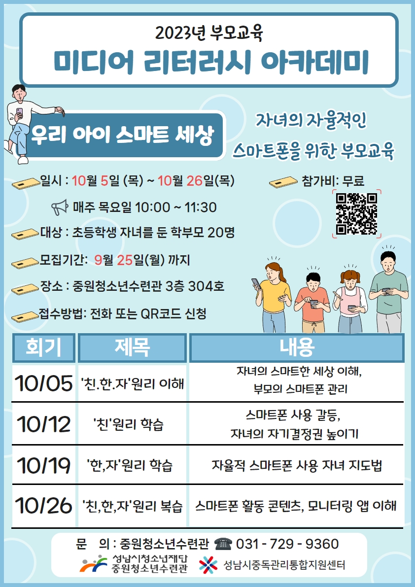 청소년의 스마트폰 과다사용 예방과 자기조절력을 기르기 위한 부모교육에 많은 관심과 신청 바랍니다.