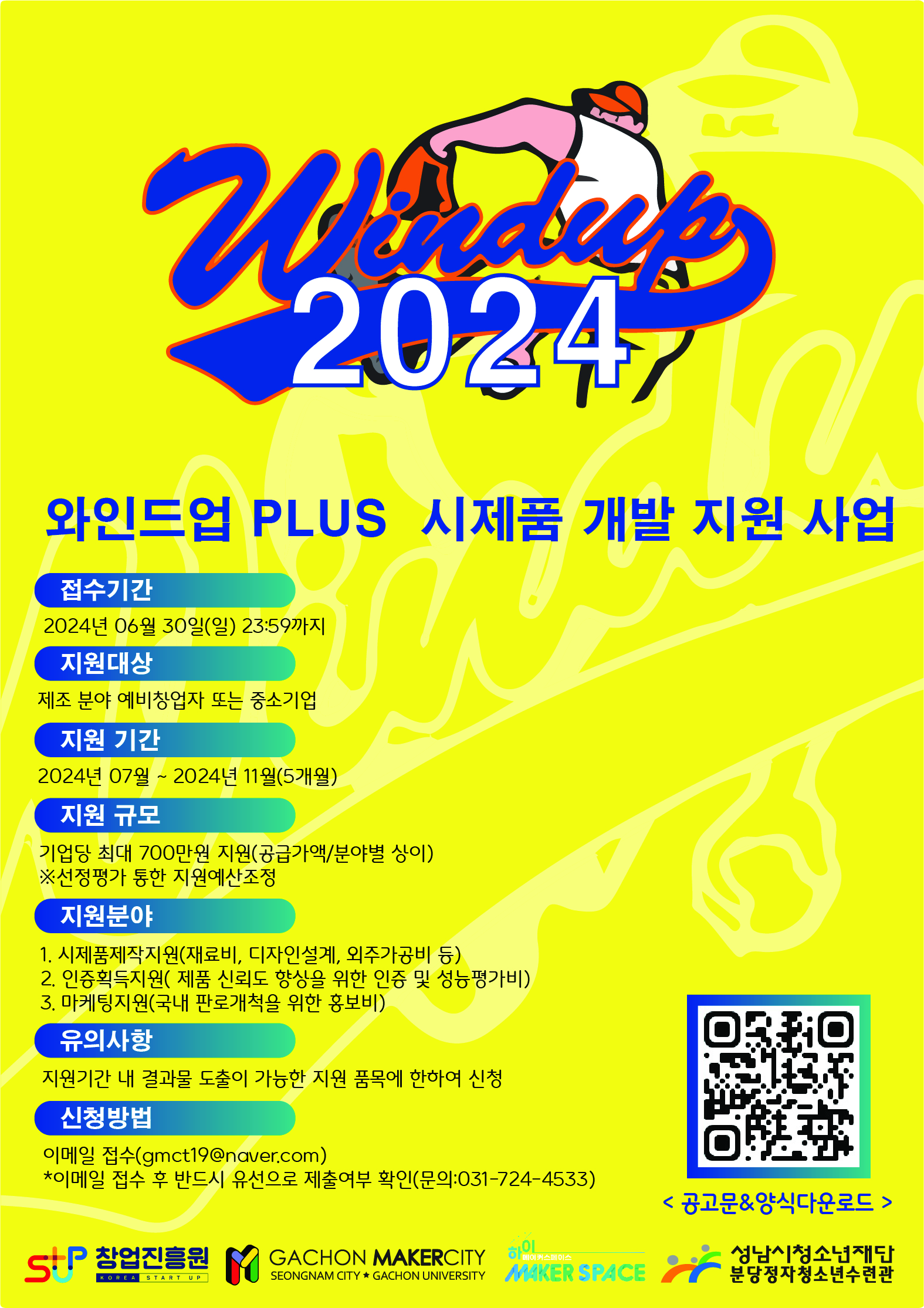 2024년 메이커 활성화 지원사업(협업형)에 분당정자청소년수련관이 창업진흥원, 가천메이커스, 하이메이커스페이스와 공동으로 참여하고 있는 (시)제품 개발 지원사업 와인드업 PLUS 참여 기업을 모집합니다.