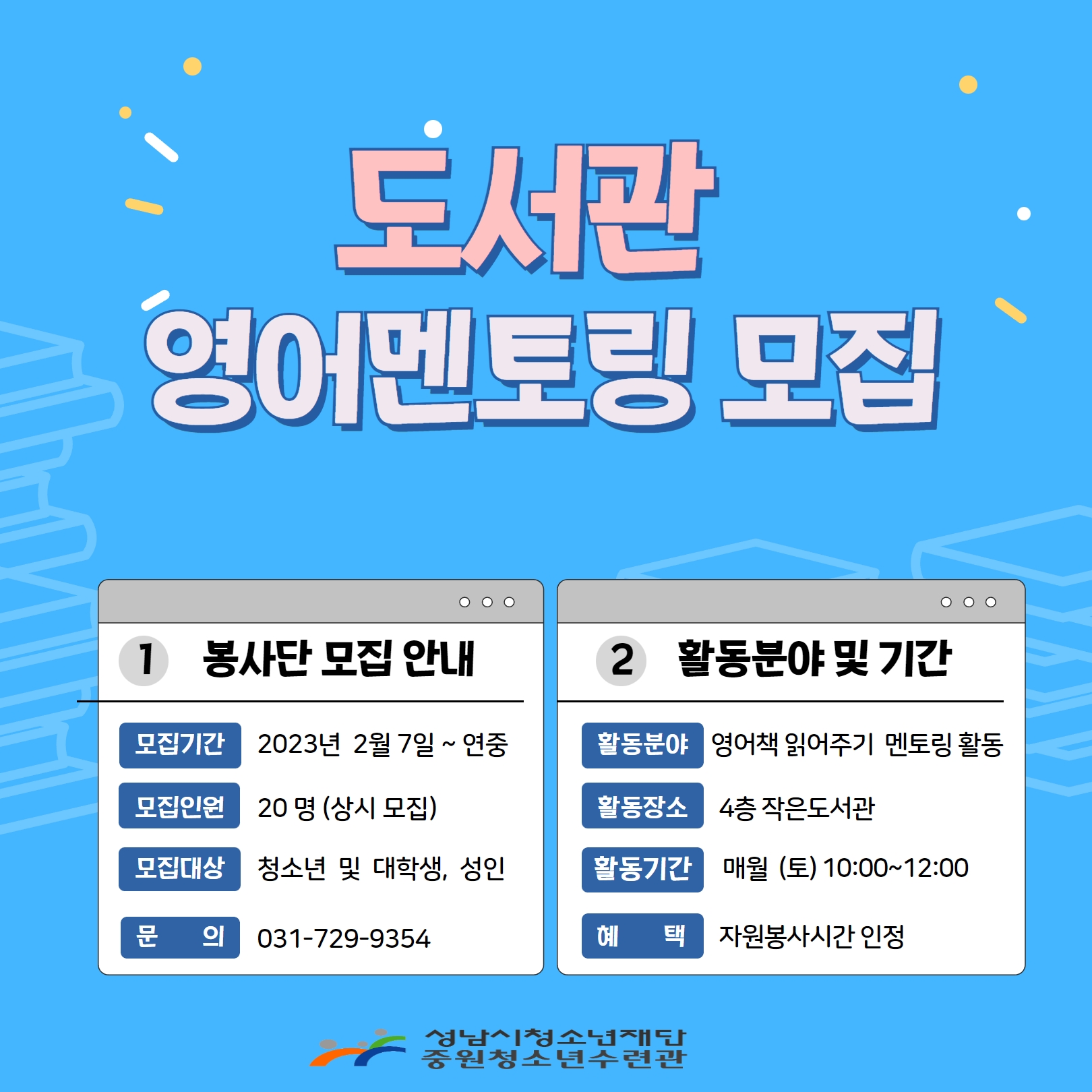 도서관 영어멘토링 모집 작성자 : 관리자 등록일자 : 2023년 2월 6일 15시 56분 56초 조회 : 1,269 도서관 영어멘토링 모집 - 모집기간: 2023. 2월 7일 ~ 연중 - 모집대상: 청소년 및 대학생, 성인- 활동내용: 영어책 읽어주기 멘토링 활동- 활동기간: 매월 (토) 10:00 ~12:00- 문 의: 031-729-9354 영어멘토링 홍보문.jpg [ Size : 536.18KB , Down : 783 ] 미리보기 다운로드 목록으로