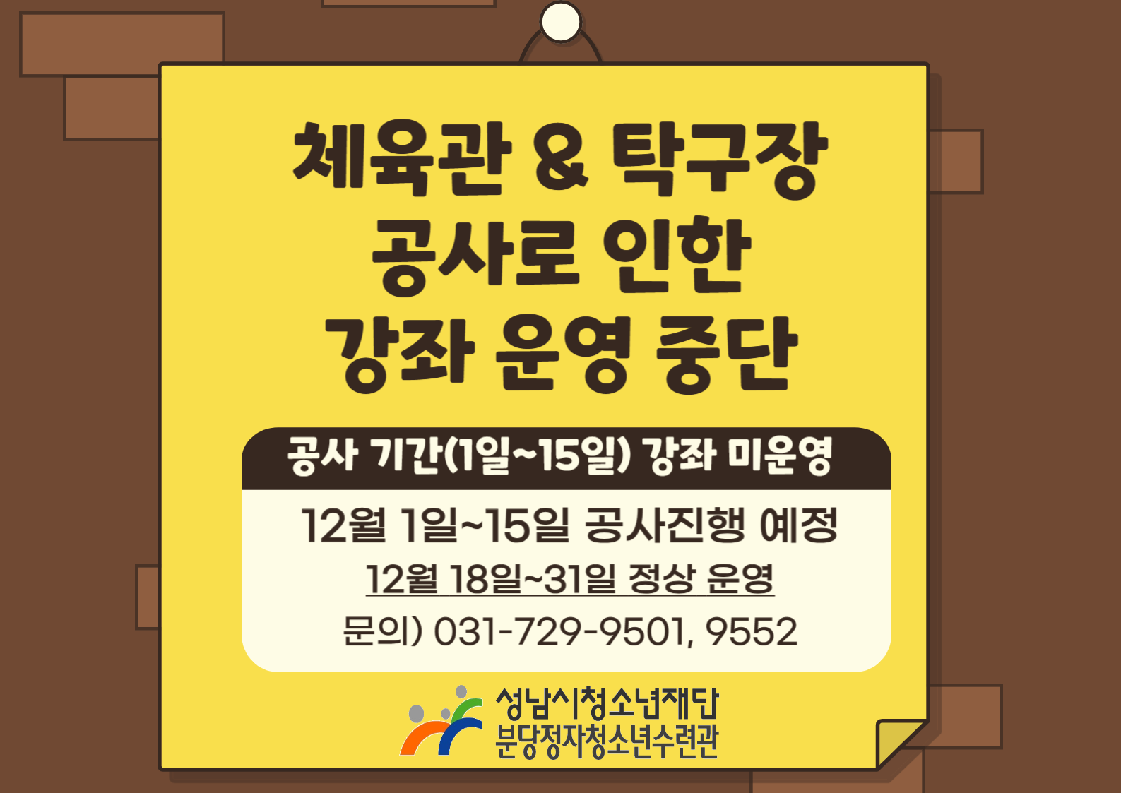 ※ 12월 체육관과 탁구장이 공사예정으로 2주간 수업진행이 불가합니다.
