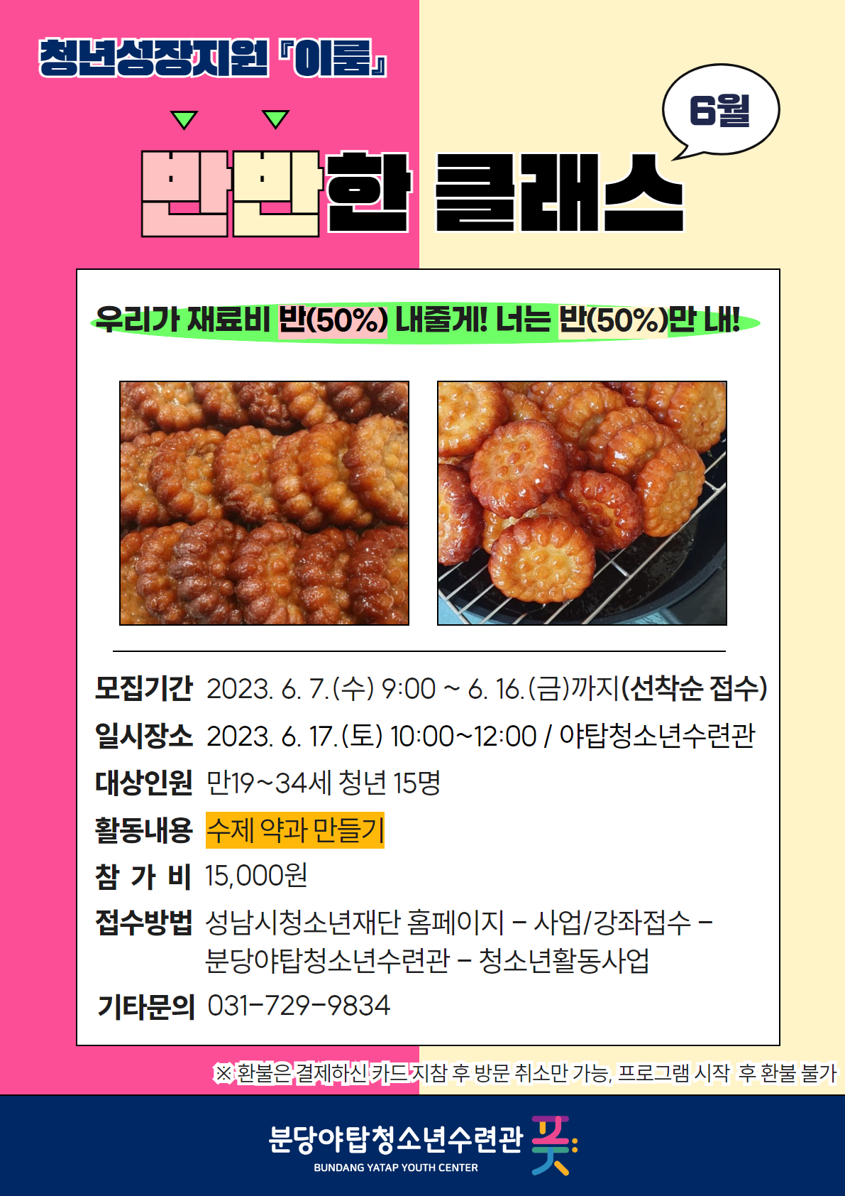 - 접수방법: 성남시청소년재단 홈페이지 - 사업/강좌접수 - 분당야탑청소년수련관 - 청소년활동사업 - 이룸 반반한 클래스