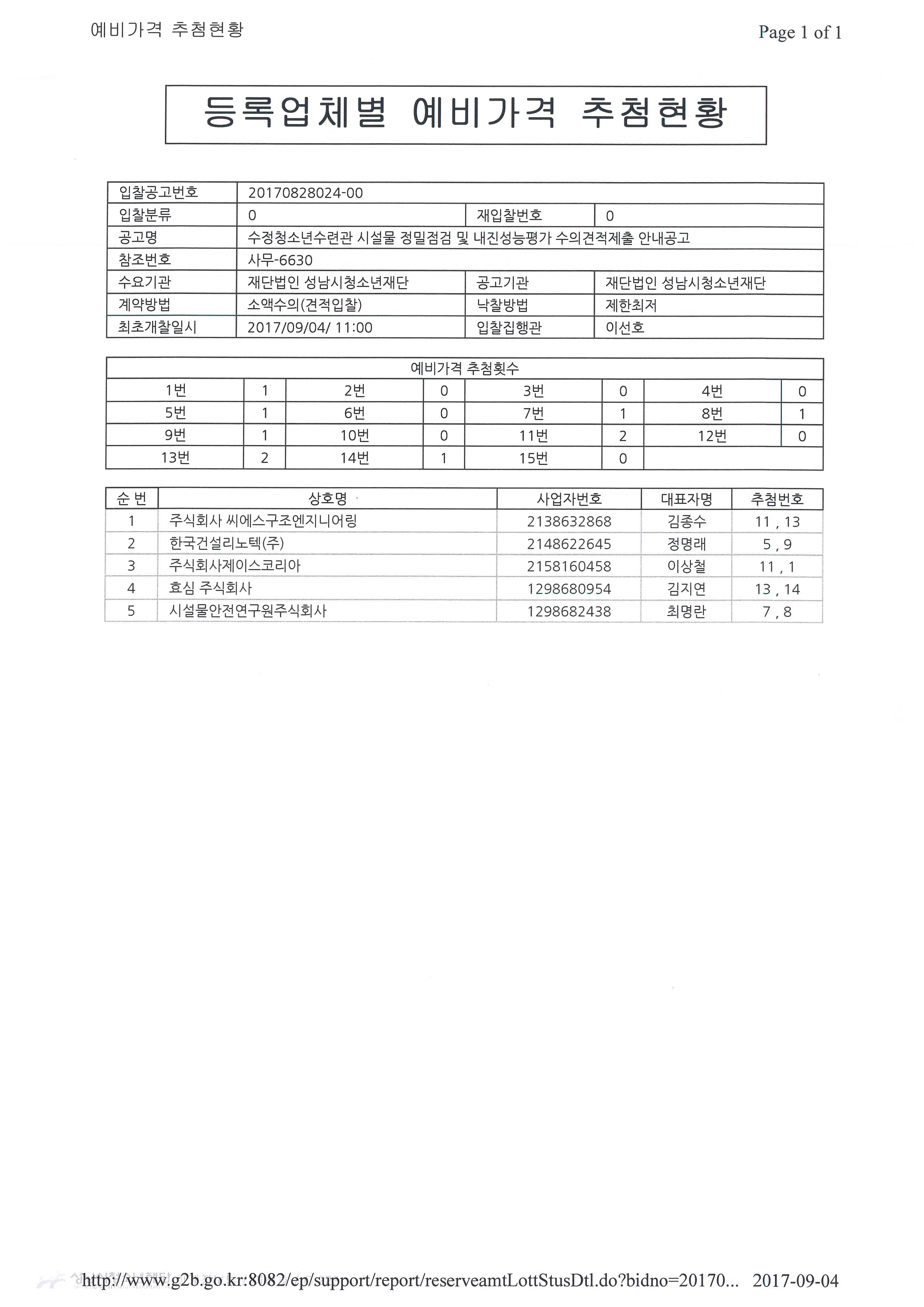 2. 위 호와 관련, 수정청소년수련관 시설물 정밀점검 및 내진성능평가 소액수의 견적제출 안내공고 결과를 아래와 같이 보고 합니다.
