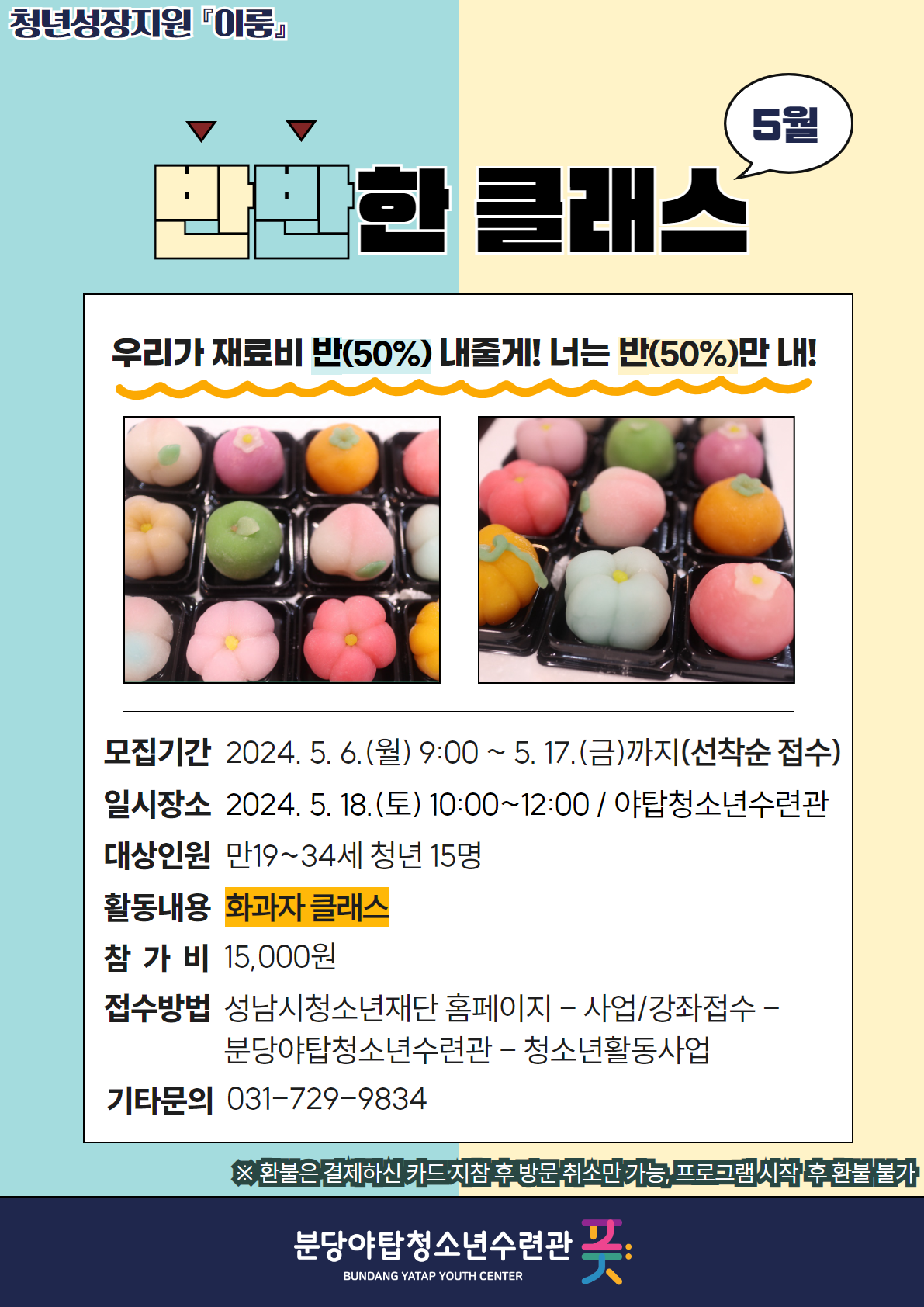 - 일시장소: 2024. 5. 18.(토) 10:00~12:00, 야탑청소년수련관 1층 풋별별 카페