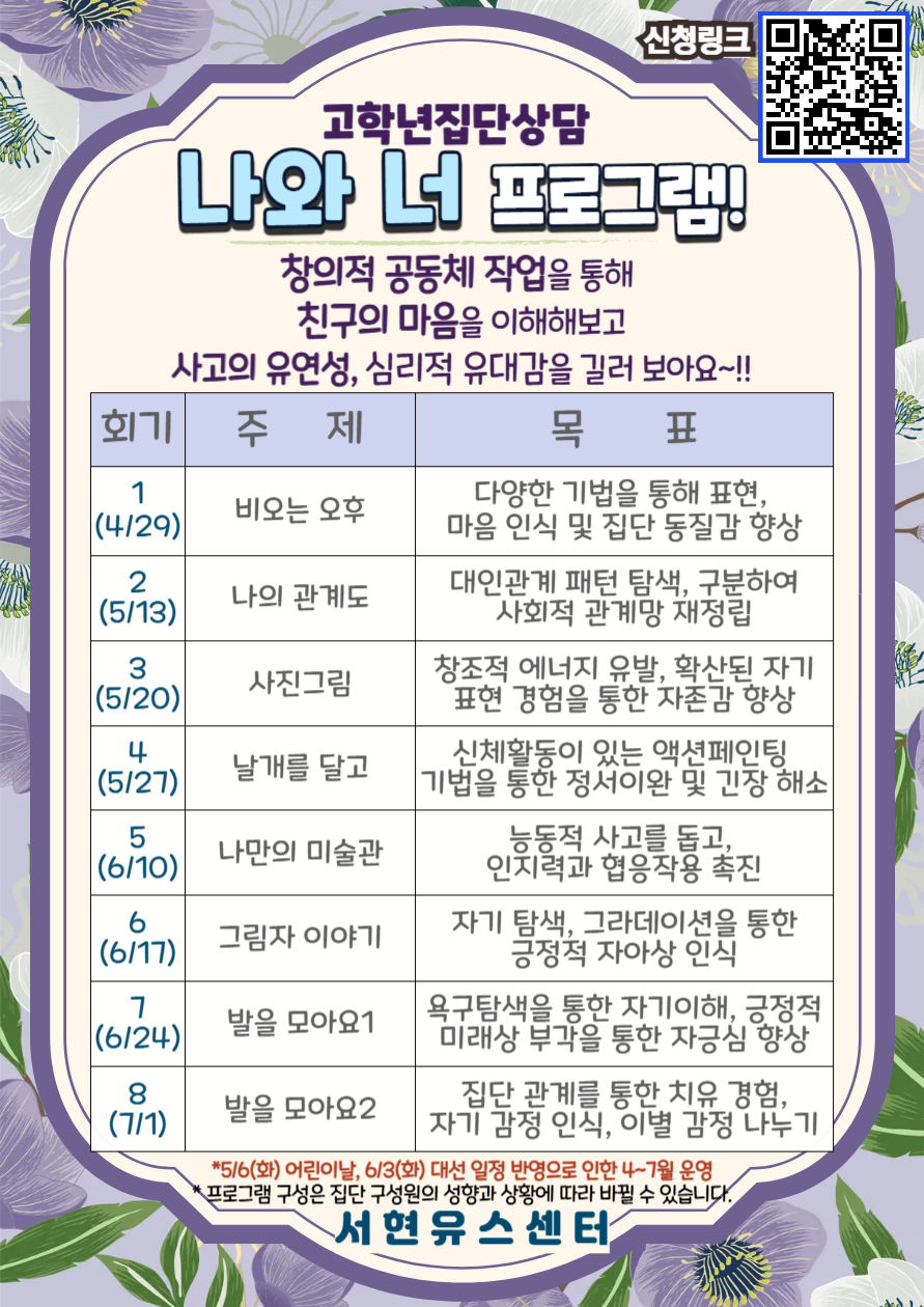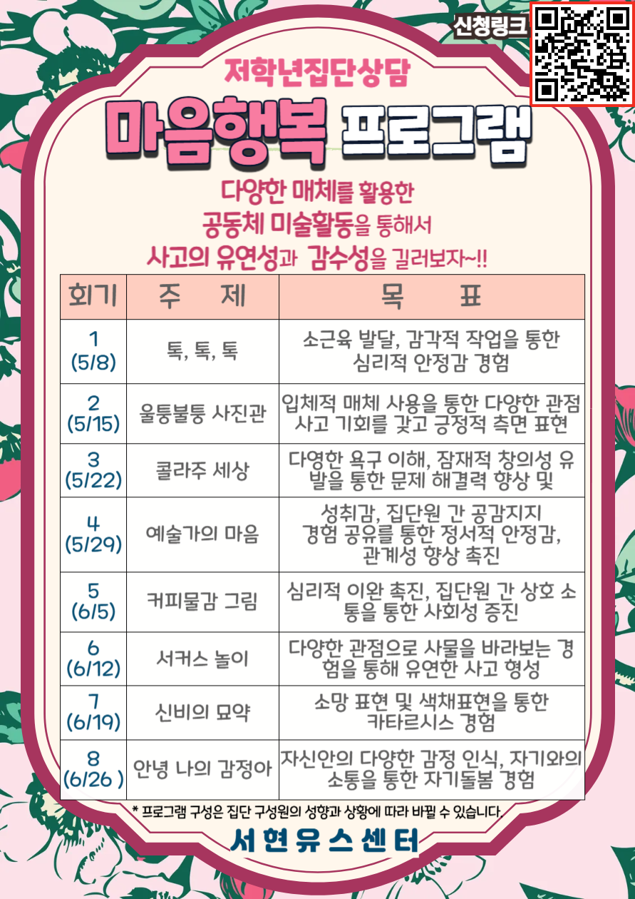 '사고의 유연성'과 '대인관계 능력' 향상에 관심이 있는 초등학생들은 위한 2025년 5, 6월 집단상담 프로그램 접수 안내드립니다.