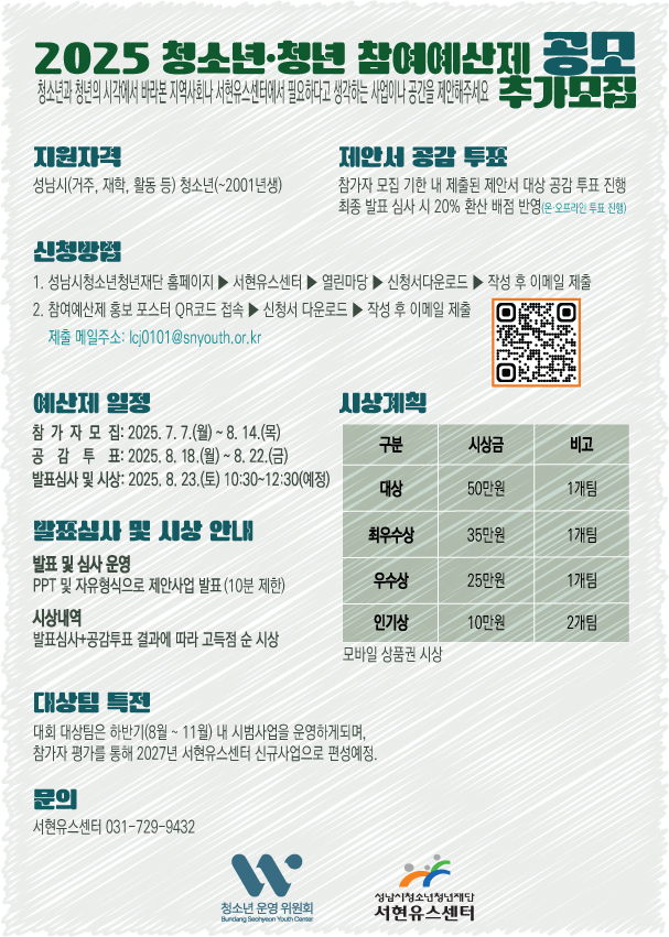 - 2025. 7. 7.(월) ~ 8. 14.(금) 자정까지, QR코드 또는 이메일(lcj0101@snyouth.or.kr) 제출