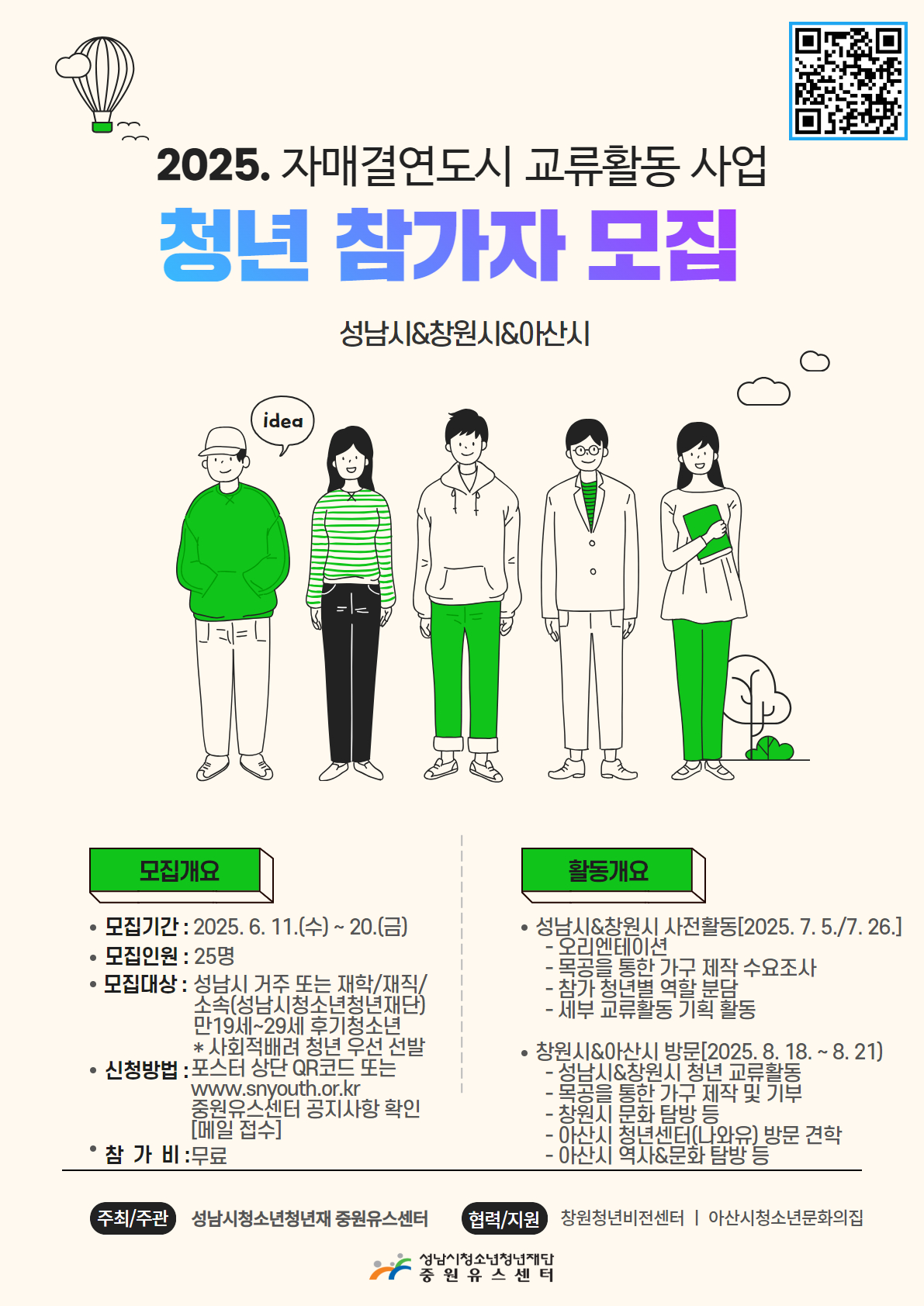 성남시청소년청년재단 중원유스센터는 2025. 성남시 자매결연도시 경상남도 창원시, 충청남도 아산시를 방문하여 청년 간 교류 활동, 문화체험 등을 진행하고 성남시 자매결연 도시와의 우호 증진을 위하여 2025. 자매결연 교류활동사업에 참가할 청년(후기청소년)을 모집하고자 하오니 많은 관심과 참여 바랍니다.