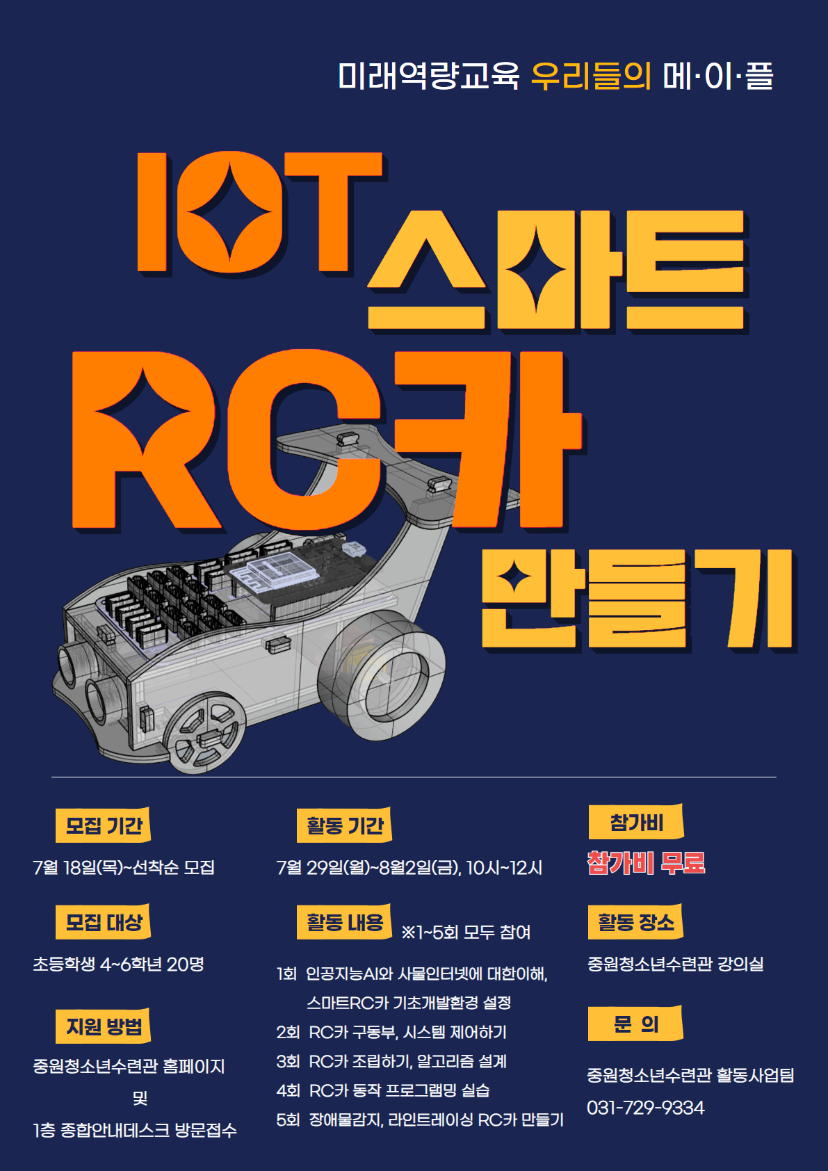 주요내용 | - 1회: 인공지능AI와 사물인터넷에 대한 이해, 스마트RC카 기초개발 환경 설정 - 2회: RC카 구동부, 시스템 제어하기 등 - 3회: RC카 조립하기, 알고리즘 설계 등 - 4회: RC카 동작 프로그램밍 실습 등 - 5회: 장애물감지, 라인트레이싱 RC카 만들기 등 |