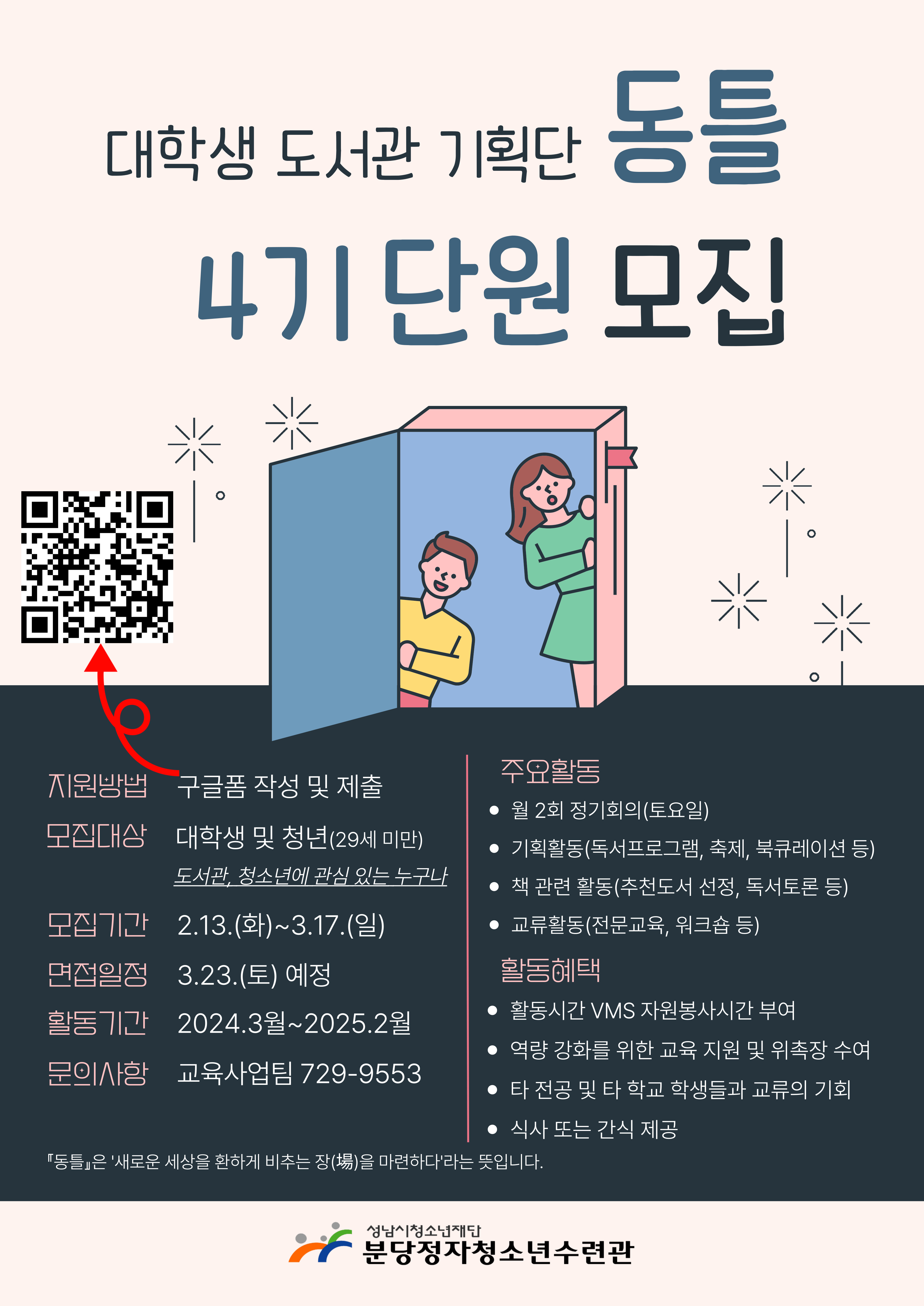 분당정자청소년수련관에서는 도서관 및 청소년활동 분야의 재능나눔(봉사)을 통해 미래를 준비하고, 청년의 여가지원 및 역량강화를 위한 대학생도서관기획단「동틀」4기 단원을 모집합니다.