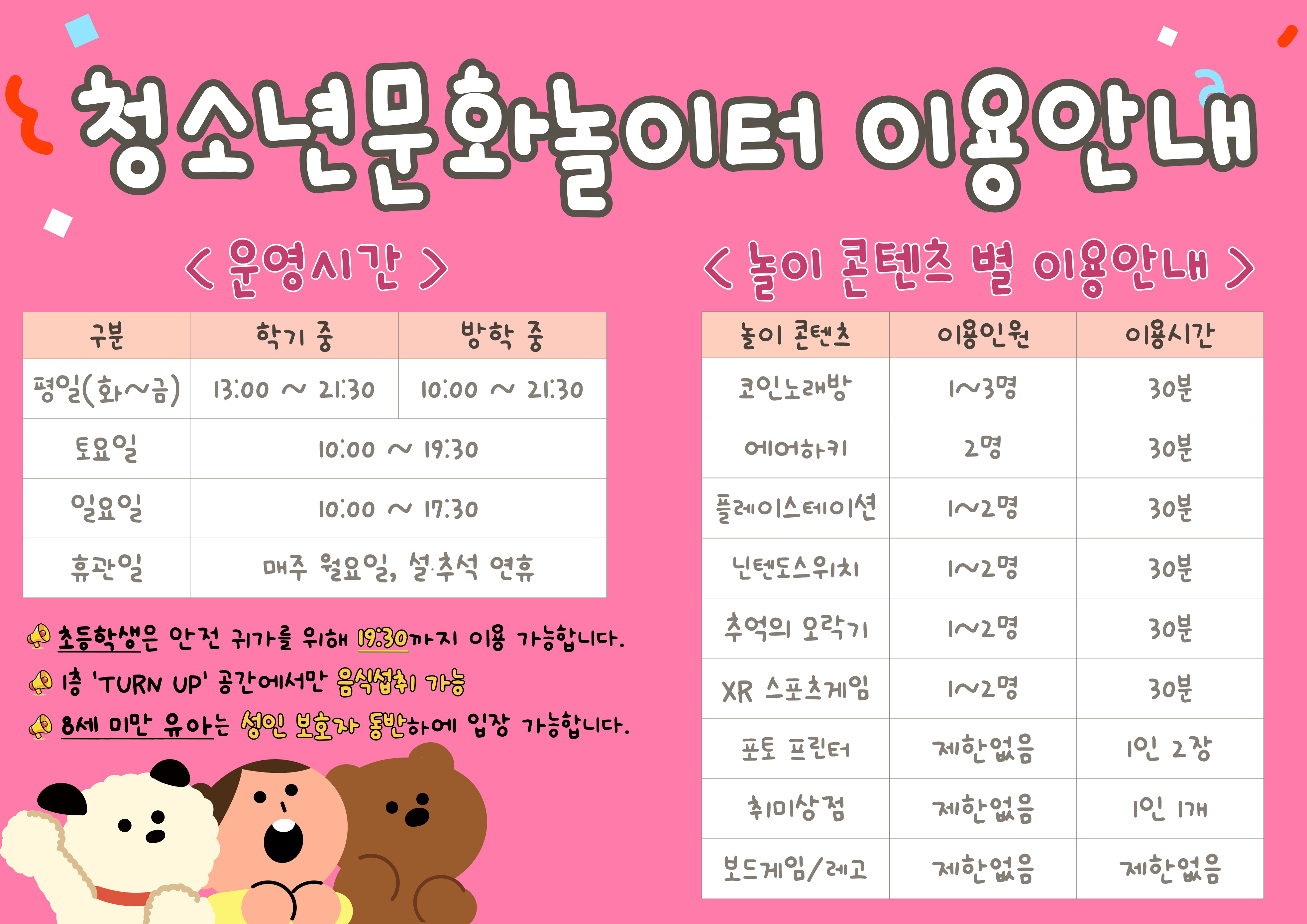 청소년 문화놀이터(2층) 이용시간 및 방법을 다음과 같이 안내드립니다:)