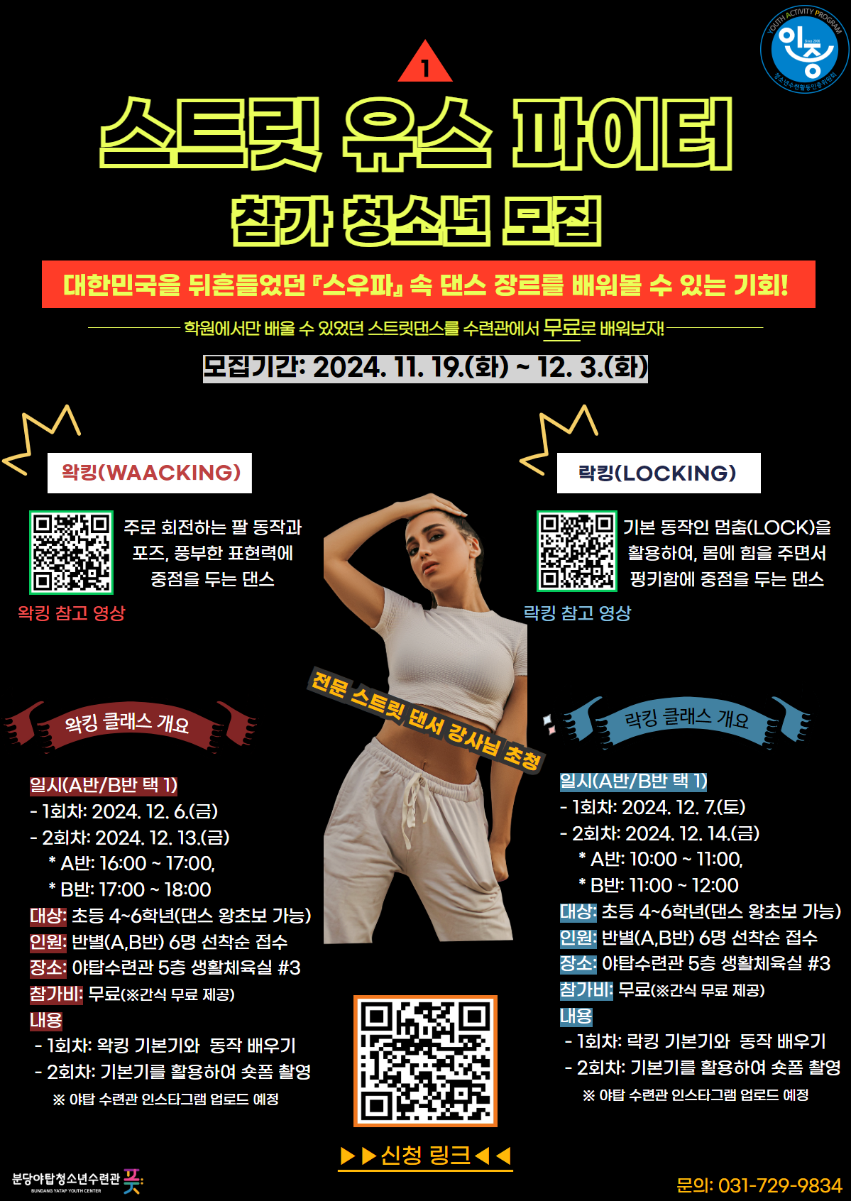 - 대상인원: 초등4~6학년, 장르 및 반별(A,B반) 6명 선착순 접수(댄스 왕초보 가능)