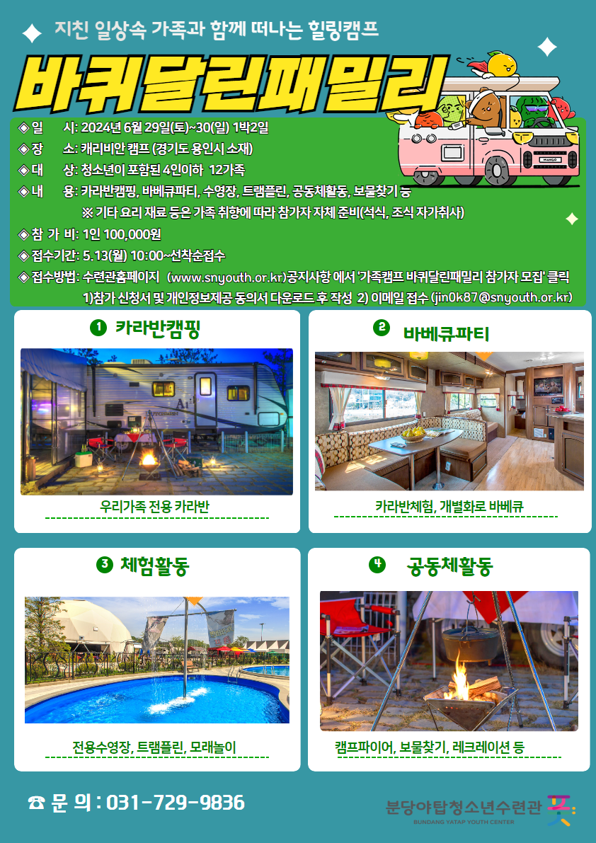 ◇ 내 용: 카라반캠핑, 바베큐파티, 수영장, 트램플린, 레크레이션, 보물찾기 등