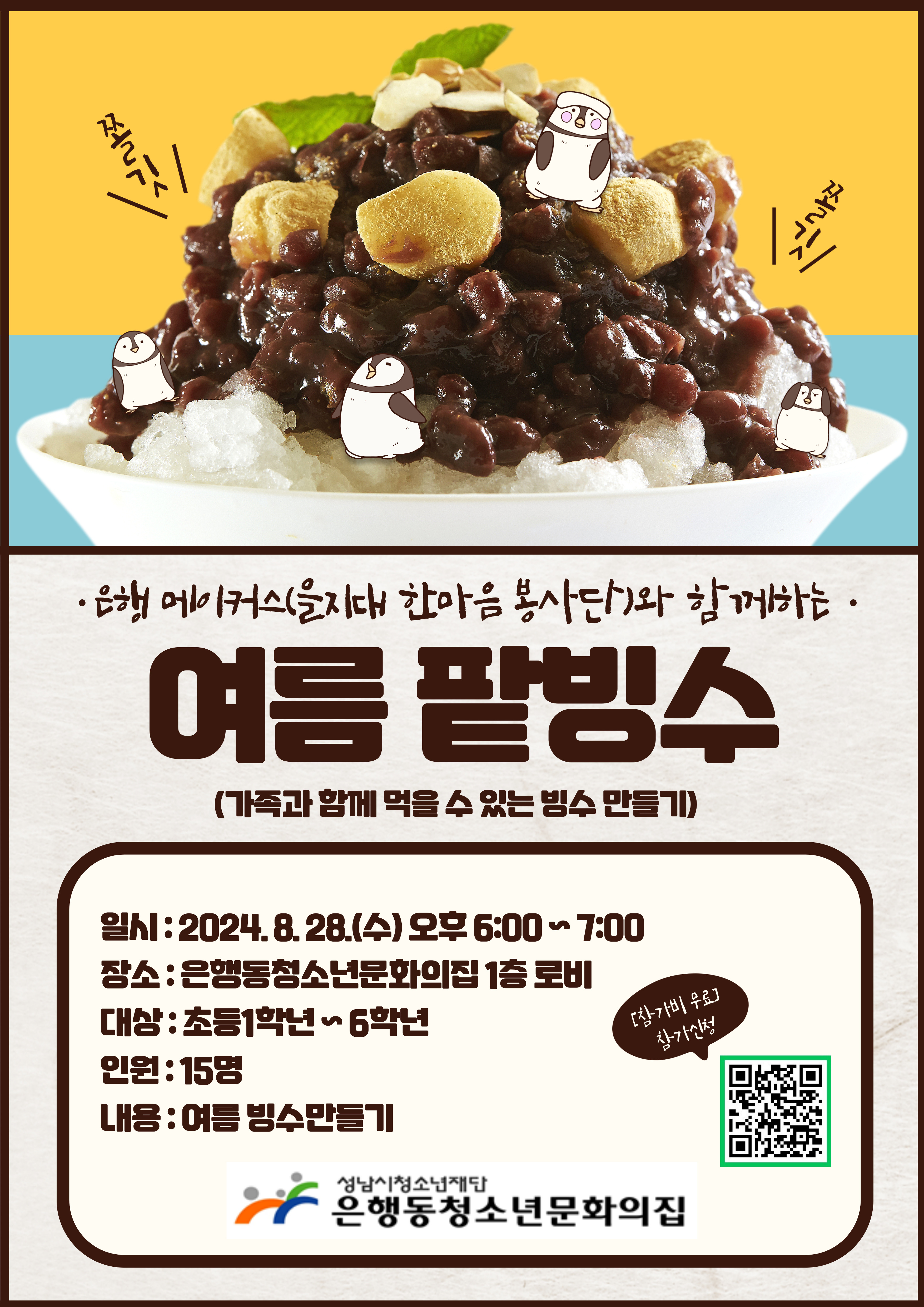 - 내용: 무더위 여름 은문집에 와서 시~원하고 달달한 '팥빙수 만들기' 하고 맛나게 먹고 가세요~!