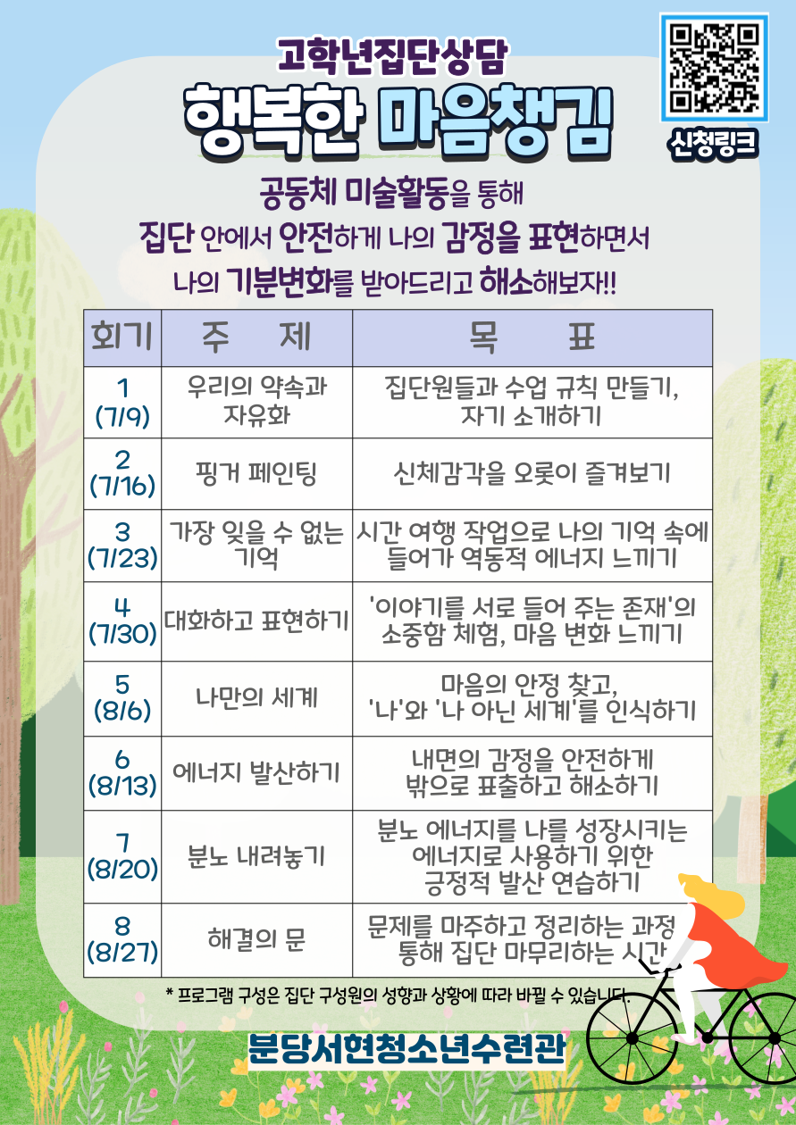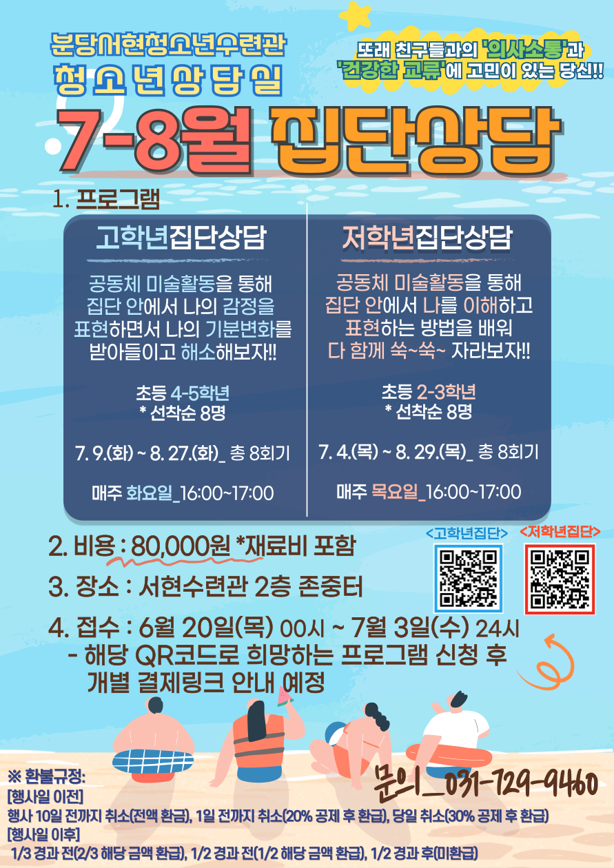또래 친구들과의 '의사소통'과 '건강한 교류'에 관심이 있는 분들을 위한 2024년 7, 8월 집단상담 프로그램 접수 안내드립니다.