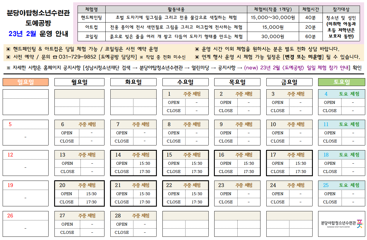 분당야탑청소년수련관 도예공방 23년 2월 운영 안내