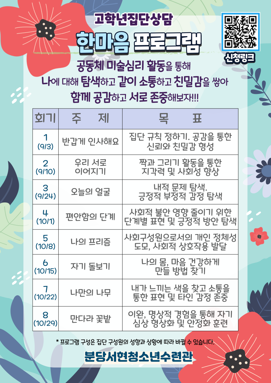 집단상담 접수는 8월 22일(목) 00시부터 9월 4일(수) 24시까지 네이버 폼으로 신청이 가능합니다!