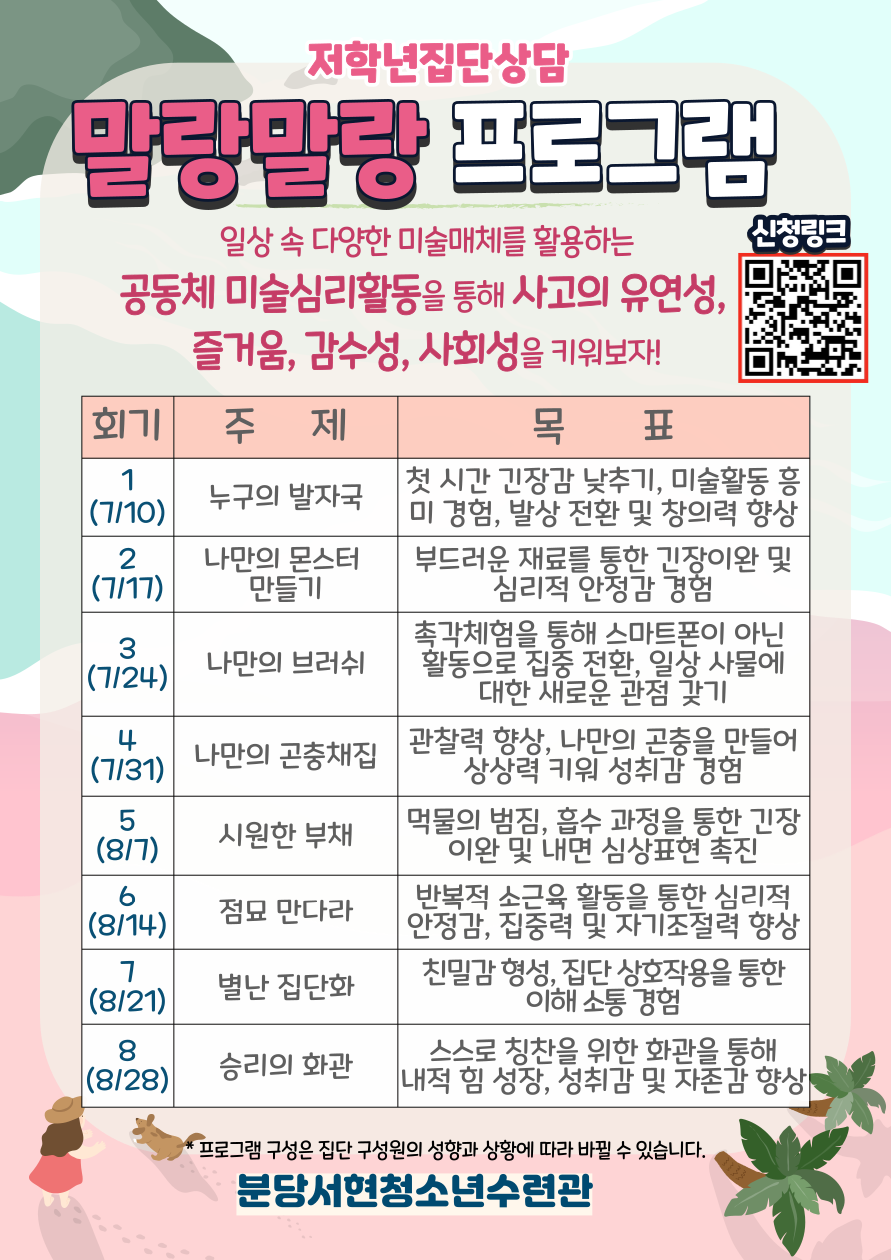 '건강한 교류'와 '사회성' 향상에 관심이 있는 초등학생들은 위한 2025년 7, 8월 집단상담 프로그램 접수 안내드립니다.