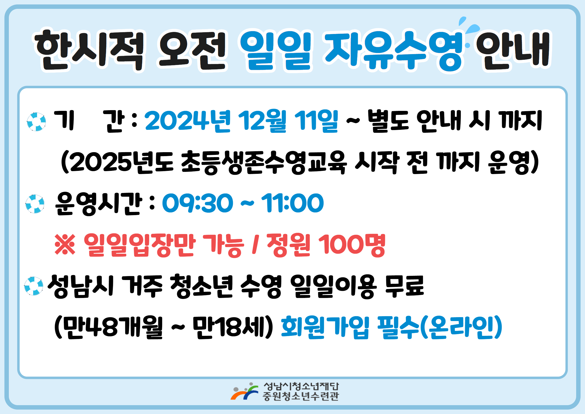 □ 성남시 거주 청소년 수영 일일이용 무료
