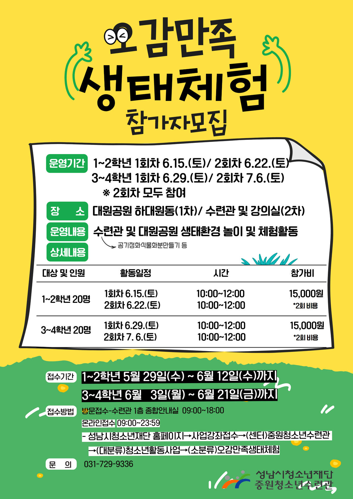 * 성남시청소년재단 홈페이지→사업강좌접수→(센터)중원청소년수련관→(대분류)청소년활동사업→(소분류)오감만족생태체험 <링크 접속 후 조회버튼 클릭>