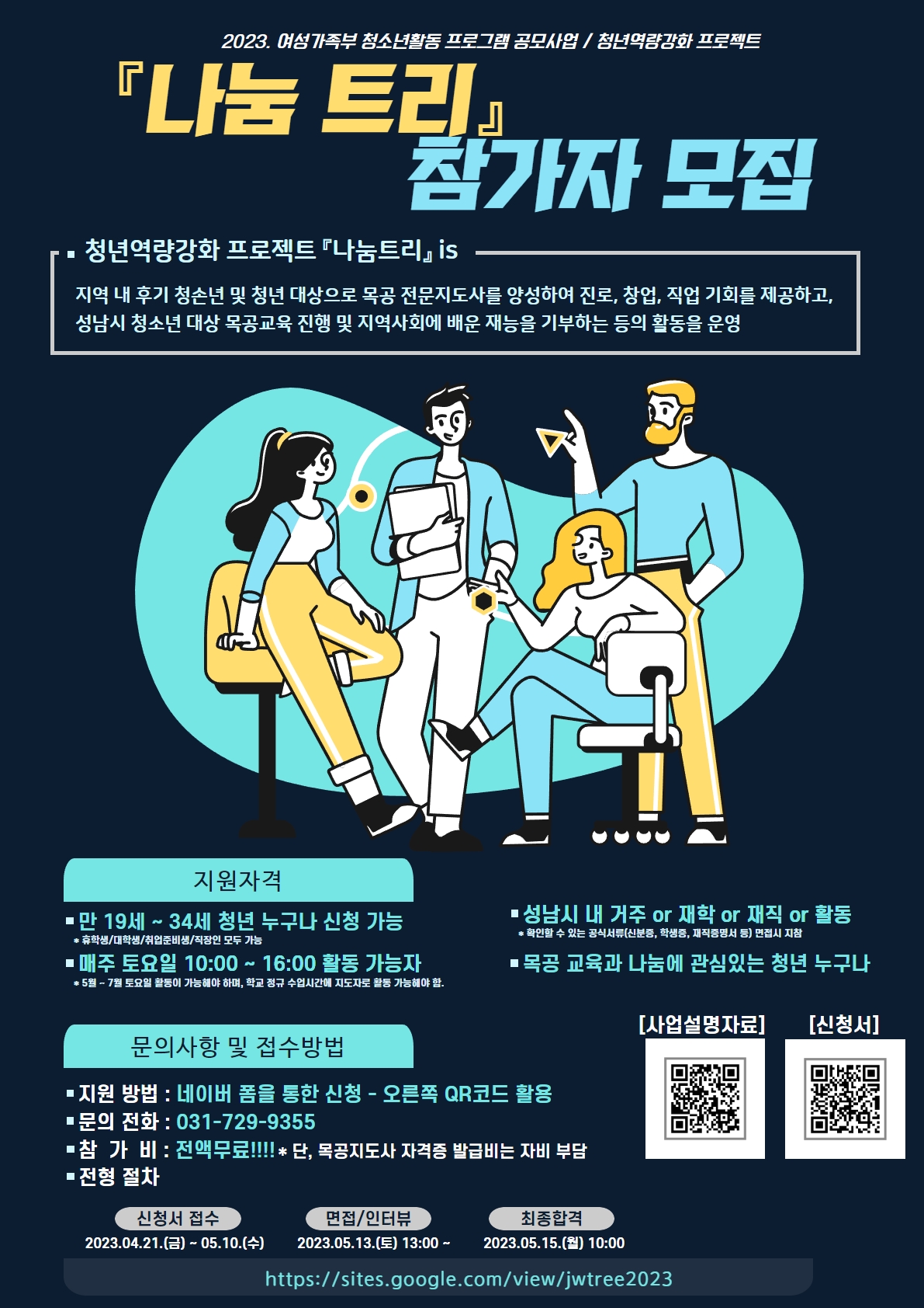 지역 내 후기 청소년 및 청년 대상 목공지도사 자격증 과정을 통해 전문가를 양성하여 진로·직업·창업의 기회를 제공하고 성남시 청소년 대상 목공 교육활동 및 청소년 유휴공간에 목공 작품기부 등 재능기부 진행을 통해 나눔을 실천하기 위한 프로그램! ▶ 온라인 설명자료 바로가기 클릭 https://sites.google.com/view/jwtree2023 |