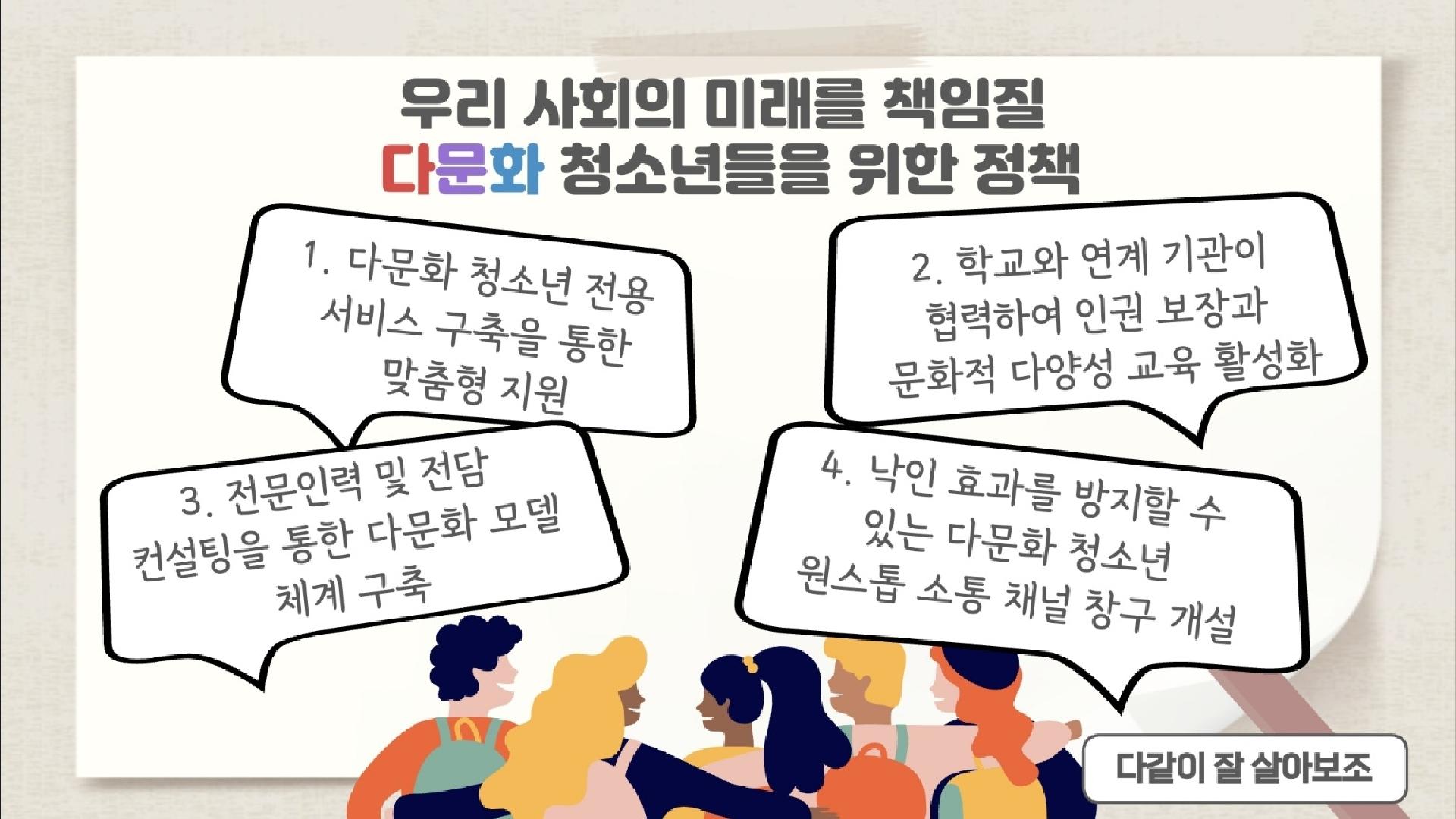 이에 다문화 청소년의 학교생활 적응을 도모하기 위하여 기존 정책을 보완하여 낙인효과 방지로 모든 청소년을 대상으로 하되, 다문화 전문인력 배치 및 다문화 청소년 맞춤형 서비스 지원과 문화적 다양성 교육 등을 제공하며 다양한 정책을 제안하고자 한다.