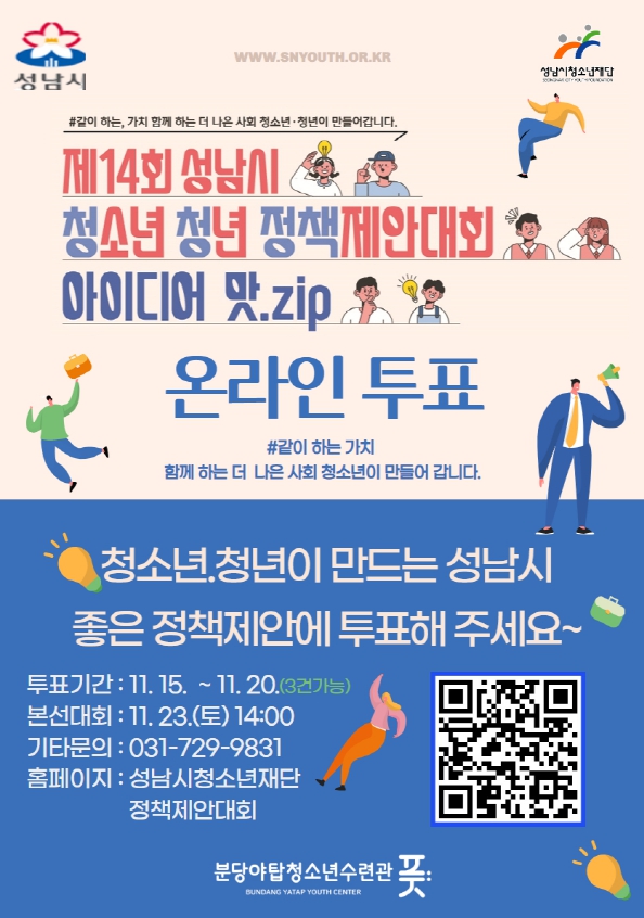 ▶ 투표방법: 포스터 내 QR코드 스캔 또는 재단 홈페이지 사업,강좌 - 정책제안대회 -네티즌 투표