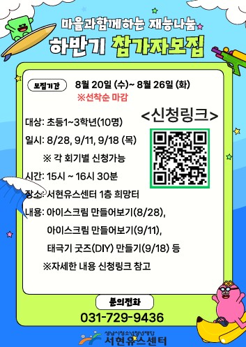 서현유스센터에서는 마을과함께하는 재능나눔 하반기 참여인원모집을 진행합니다.