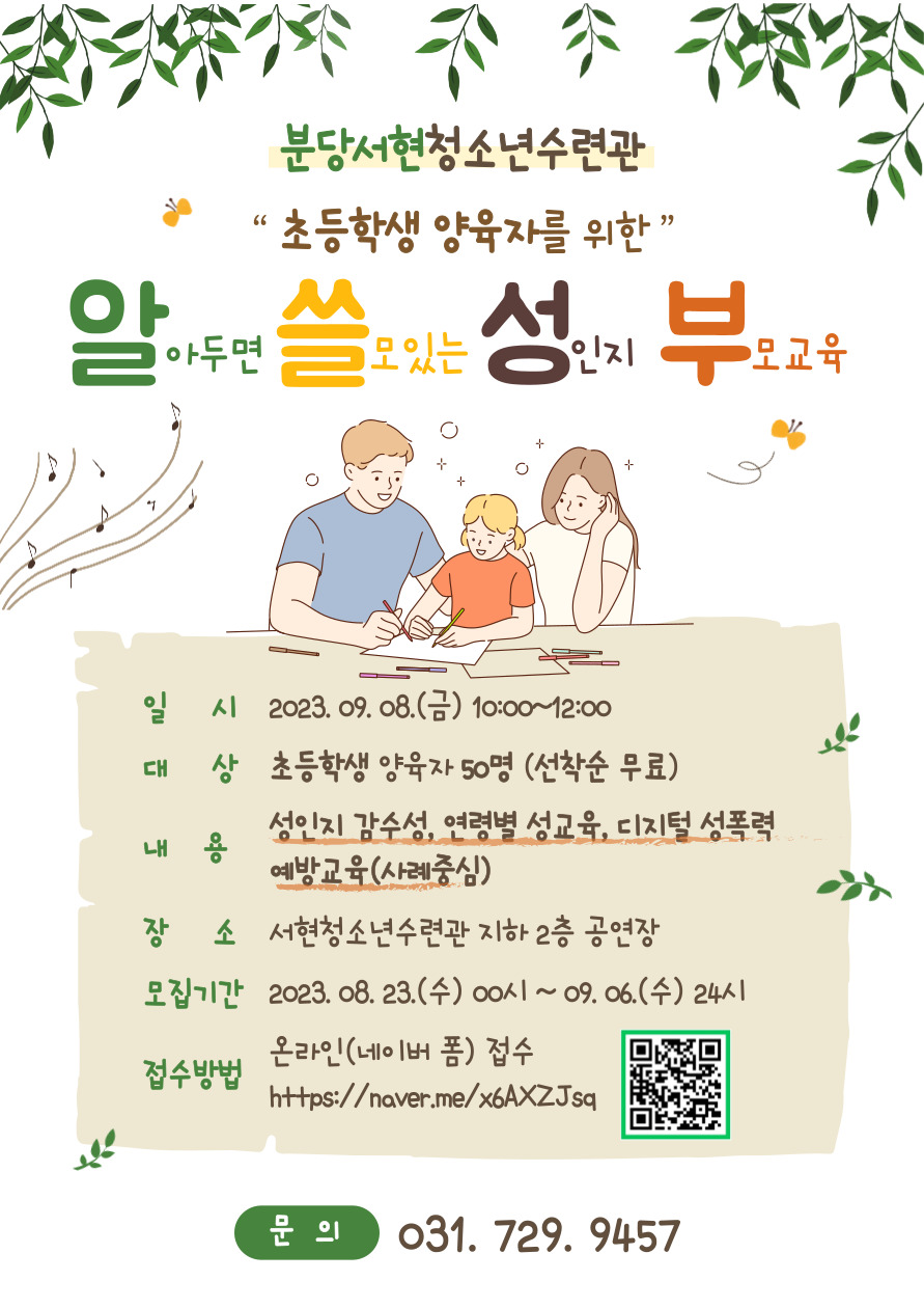 초등학생 양육자를 대상으로 청소년들의 건강한 성가치관과 성적 자기결정권을 확립해 청소년이 행복한 세상을 만들기 위하여 알.쓸.성.부. 알아두면 쓸모있는 성인지 부모교육을 진행하고자 합니다.