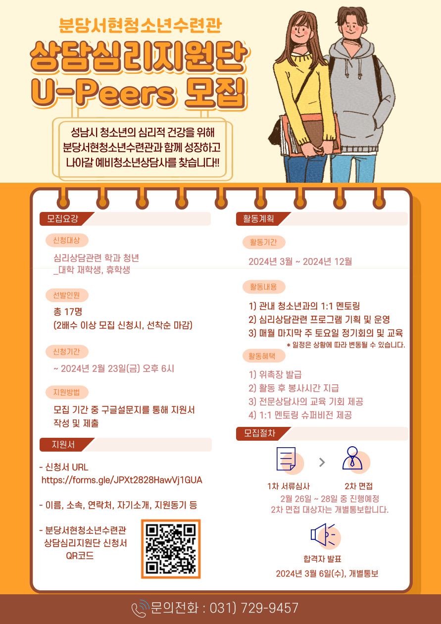 분당서현청소년수련관에서 함께 성장하고 나아갈 예비청소년상담사 2024 상담심리지원단 U-Peers를 모집하고자 합니다!!