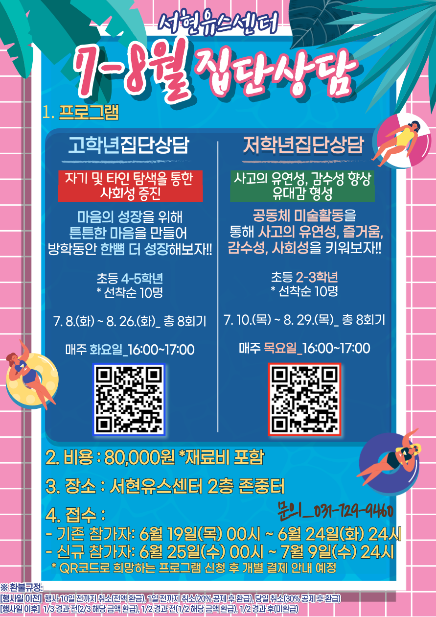 '건강한 교류'와 '사회성' 향상에 관심이 있는 초등학생들은 위한 2025년 7, 8월 집단상담 프로그램 접수 안내드립니다.